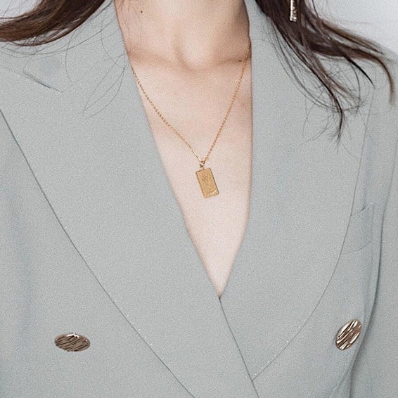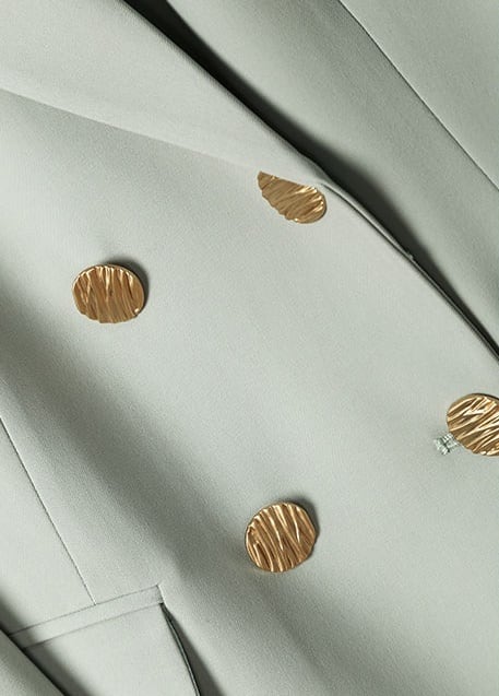 ハイウエストとテクスチャ入りのメタルボタンがレトロで上品なジャケットと