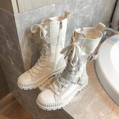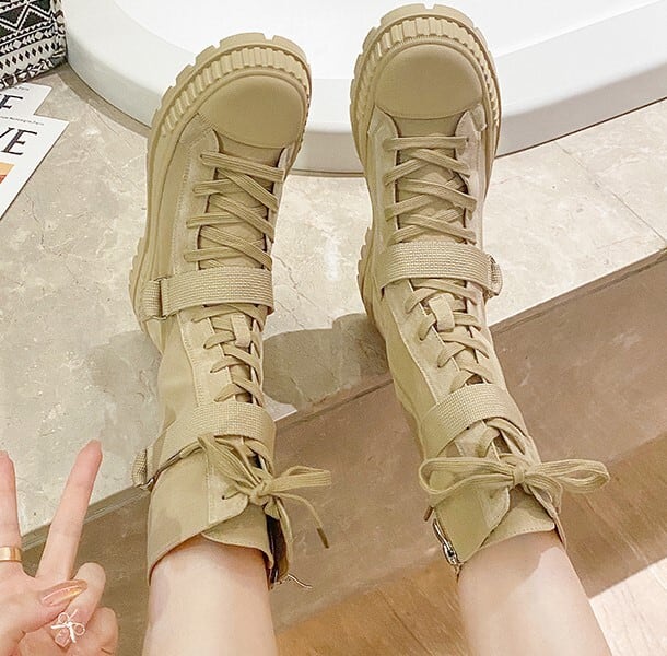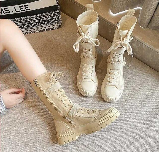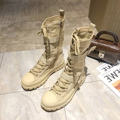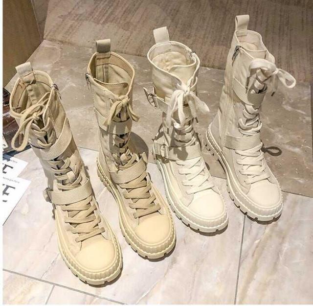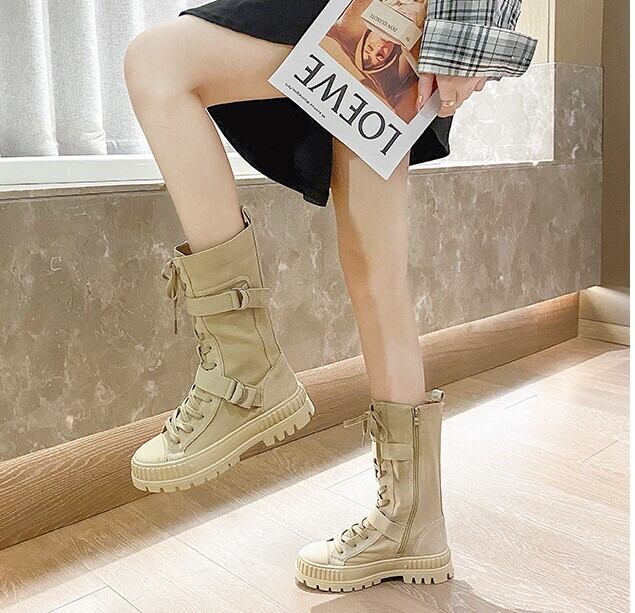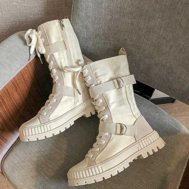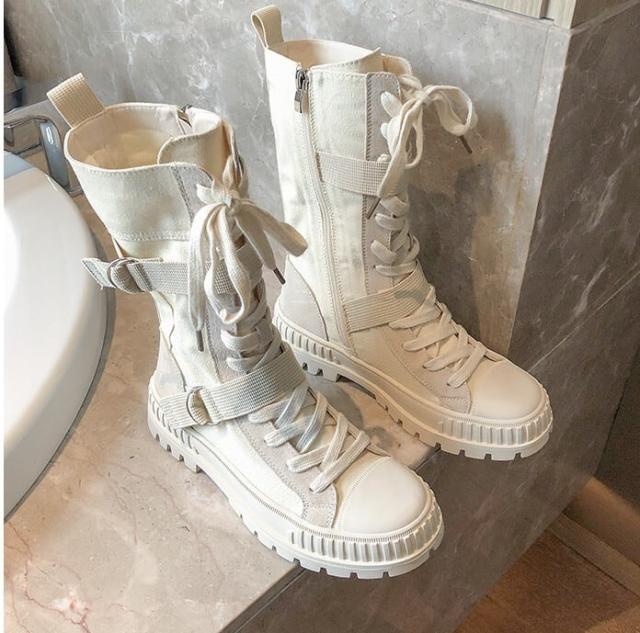 キャンバス地の生地にレースアップ、ベルトが付いた個性的なミディアムブーツ