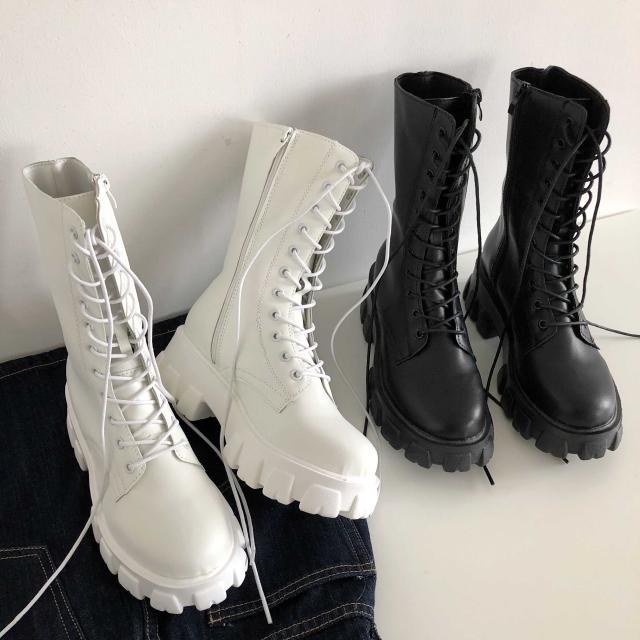 レディース ミディ丈 ブーツ レース アップ ブーツ 編み上げ ブーツ 4.5cmヒール 太ヒール タンクソール PU 歩きやすい 韓国 かっこいい カジュアル 可愛い かわいい ラクチン 流行り