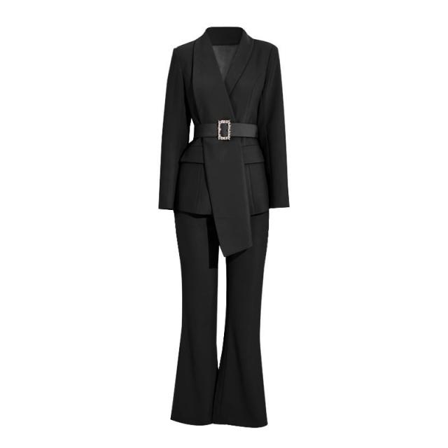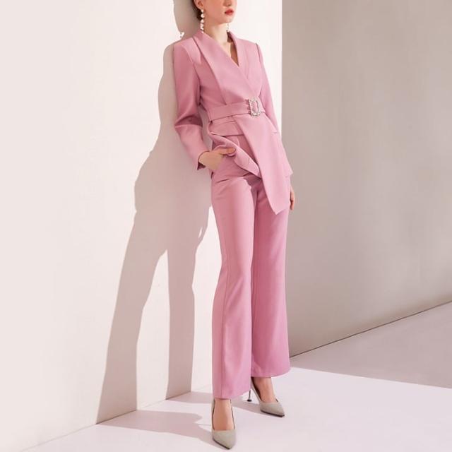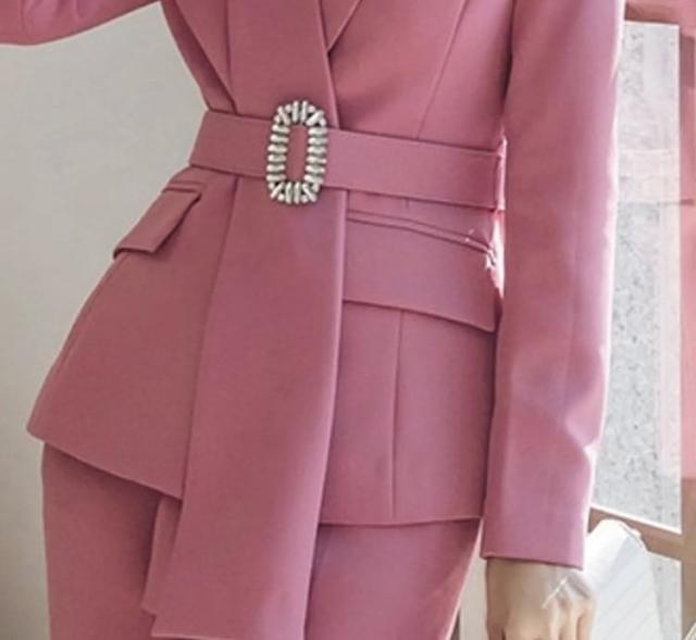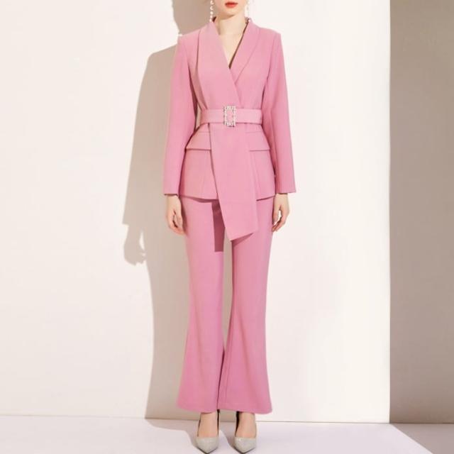 セットアップ スーツ パンツ ボトムス ジャケットベルト アシンメトリー ハイウエスト ビジュー スクエアバックル 長袖 ロング セミフレア ストレート 襟付き Vネック レトロ