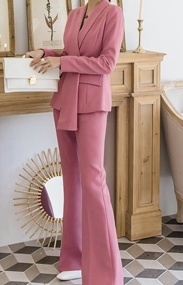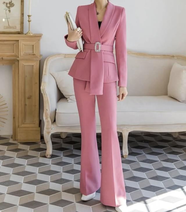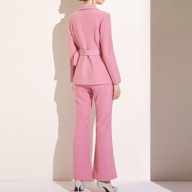 メリハリのあるスリムな仕立てが綺麗なフレアパンツスーツセットです。