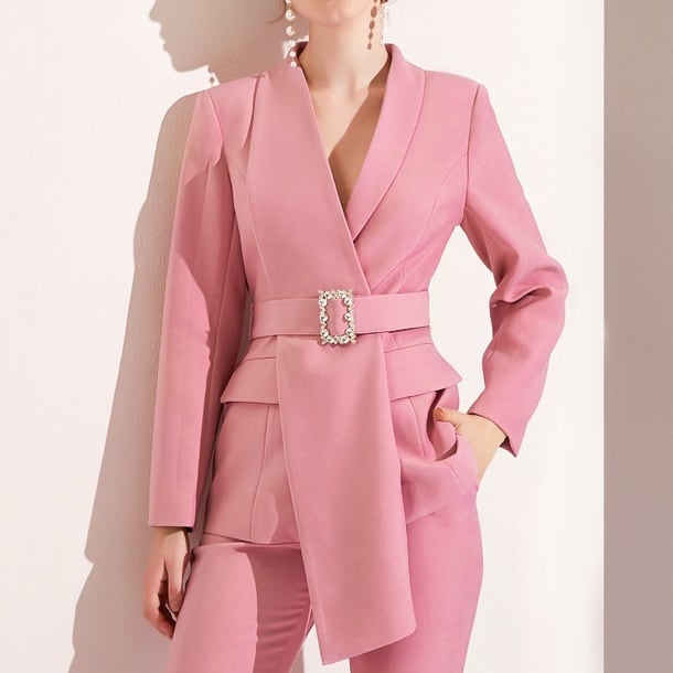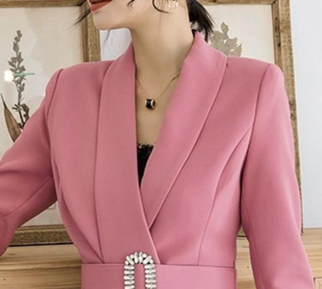 ハイウエストとビジューバックル付きウエストマークでスタイルアップが叶うジャケットと