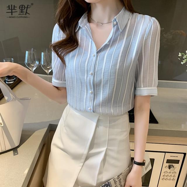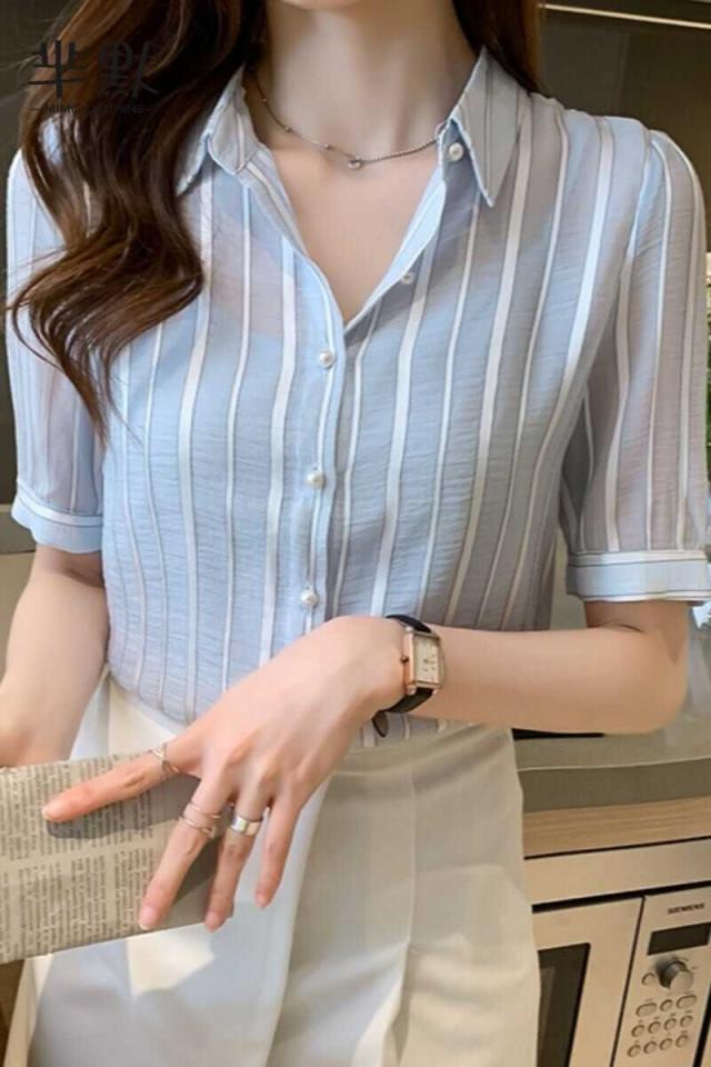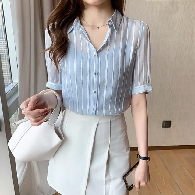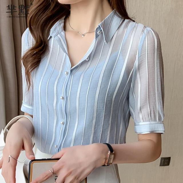 トップス ブラウス 袖あり 五分袖 シフォン かわいい 大人可愛い きれいめ 大人 上品 おしゃれ キュート ガーリー ストライプ 春 秋 10代 20代 30代 レディース オフィス OL 通勤 デート