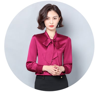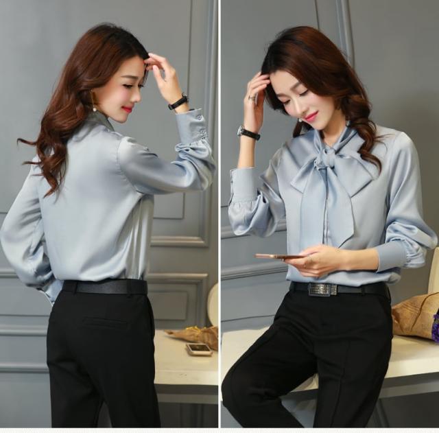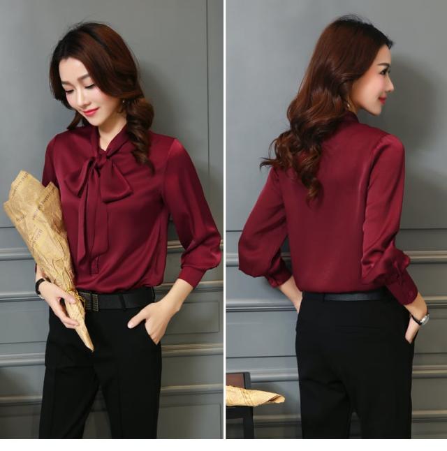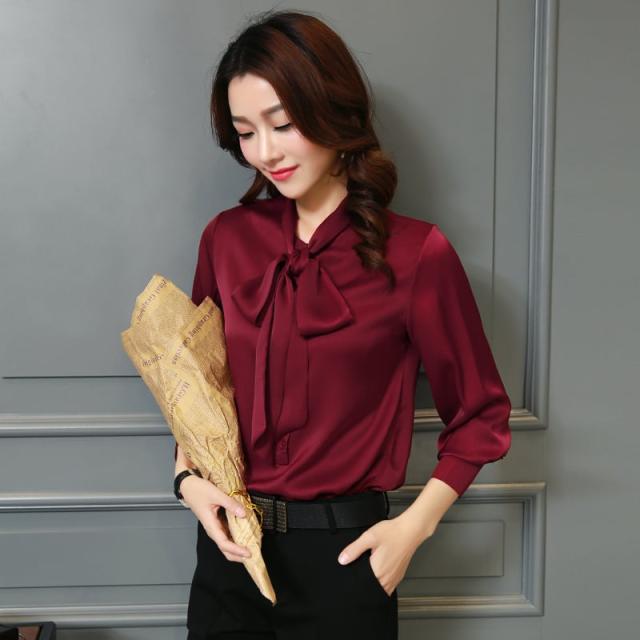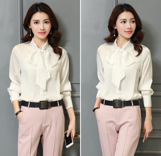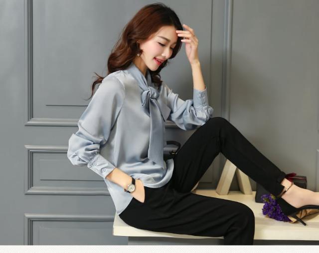ボディーラインを美しく演出するデザインのボウタイリボンブラウス。