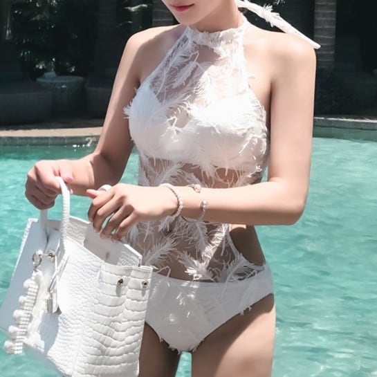 セクシーでオシャレに仕上がった大人可愛い、ホルターネックの胸元からウエストのレースが素敵なモノキニ水着です。