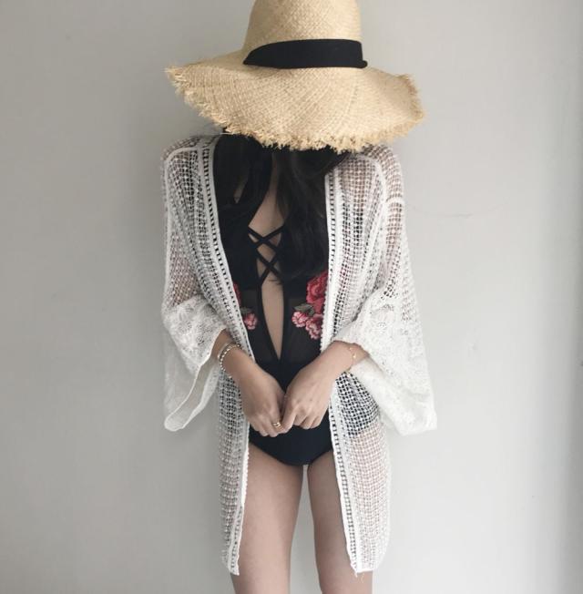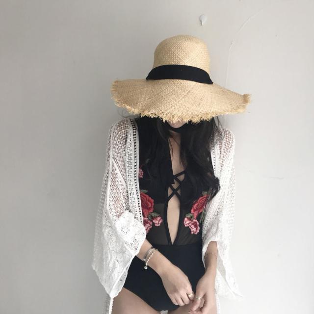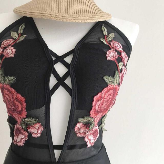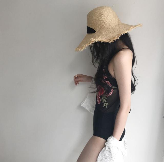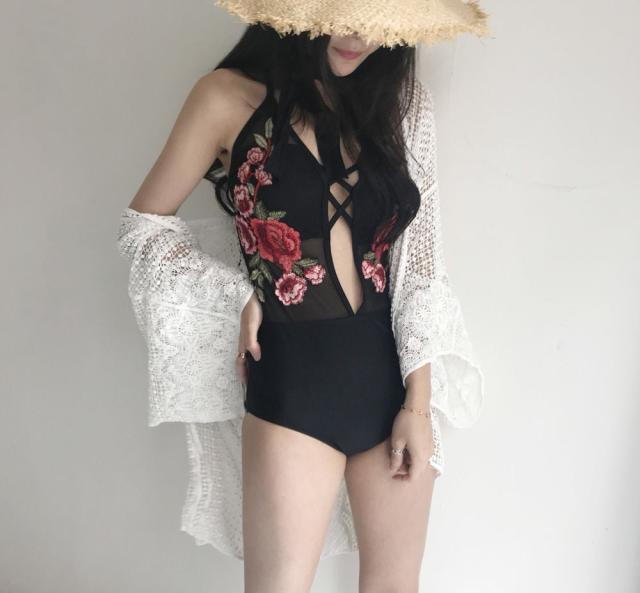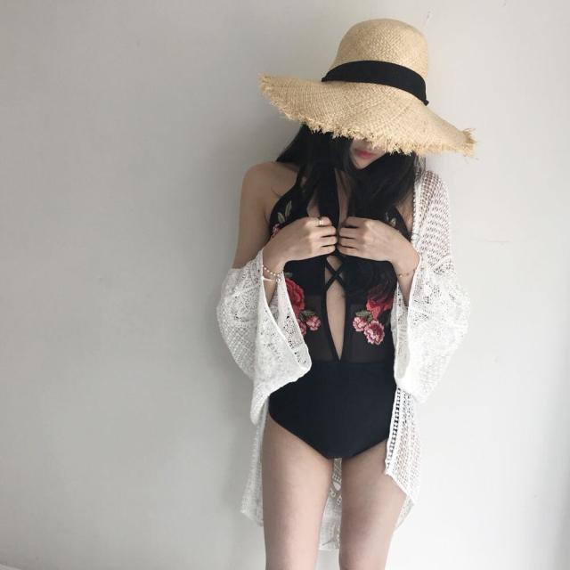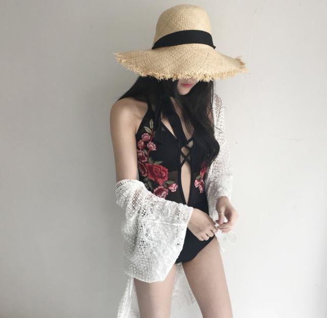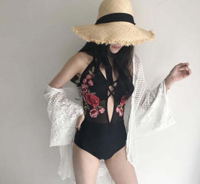 女性らしい遊び心ある水着に。大きく開いた大胆な胸元がポイント