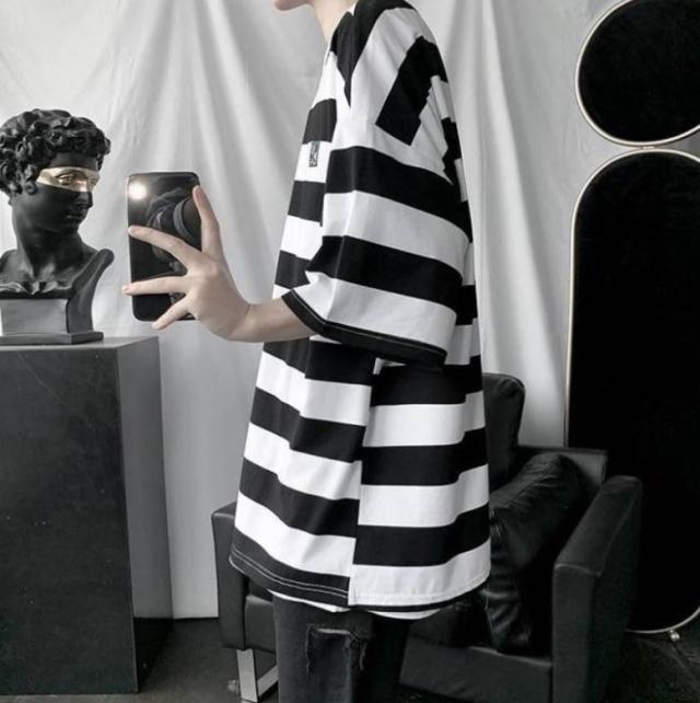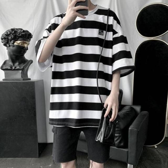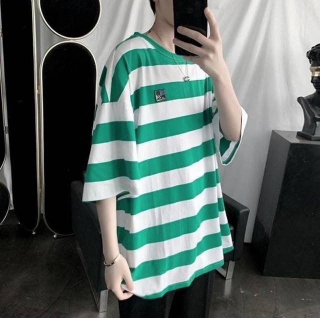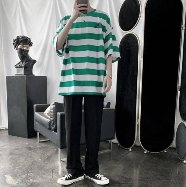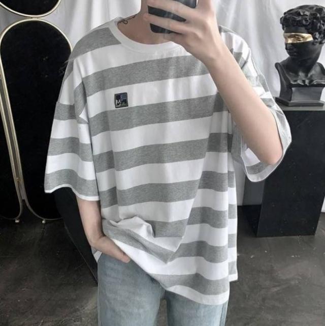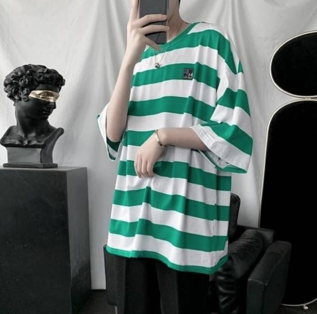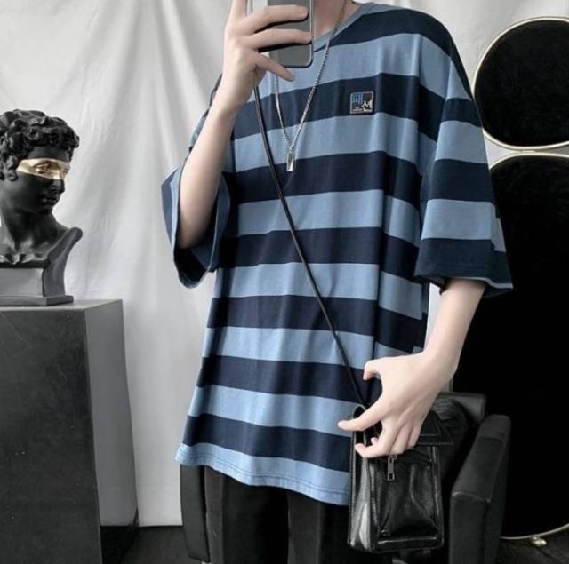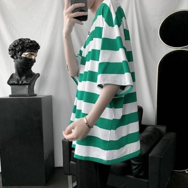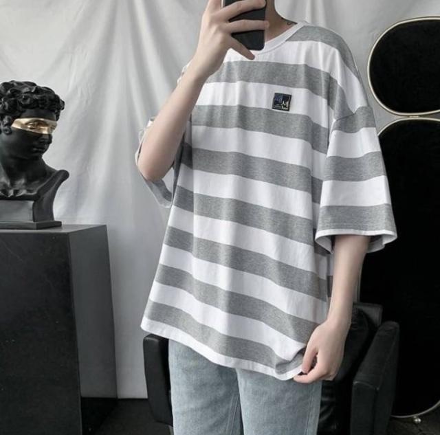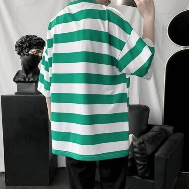 太めのストライプ柄が爽やかな印象のラウンドネックTシャツ。