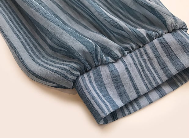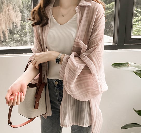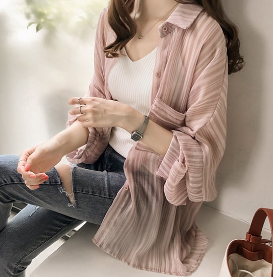 ストライプデザインの長袖ブラウスはトレンド押さえたシアー感が◎