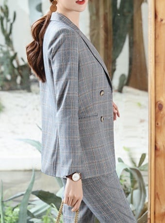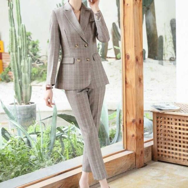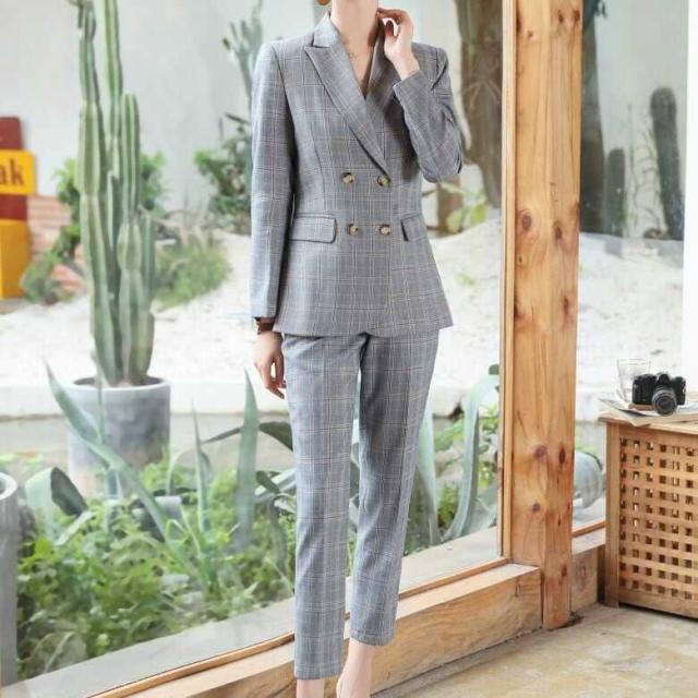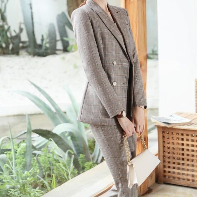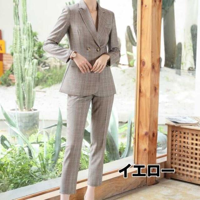 メリハリのあるスリムな仕立てが綺麗なチェックパンツスーツセットです。