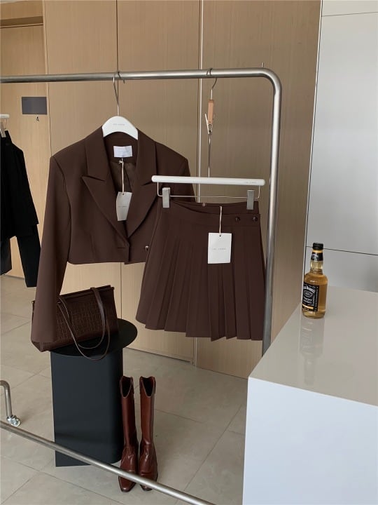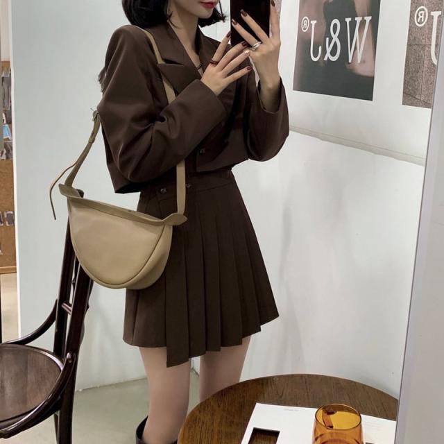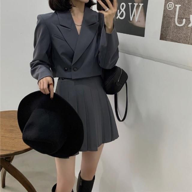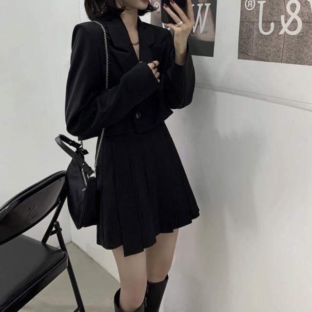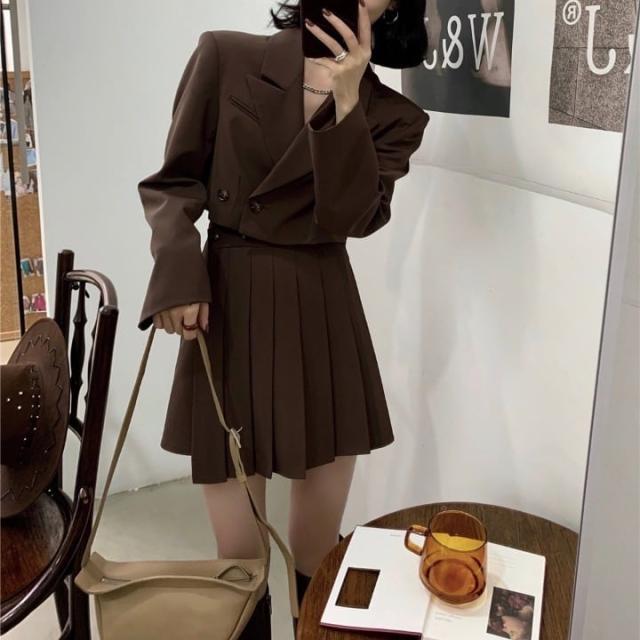セットアップ ジャケット 上着 2点セット スーツ テニススカート レイヤード プリーツ パワーショルダー クロップ丈 ジャケット ショート レトロ 膝上 袖あり 長袖 上下セット 2点セット