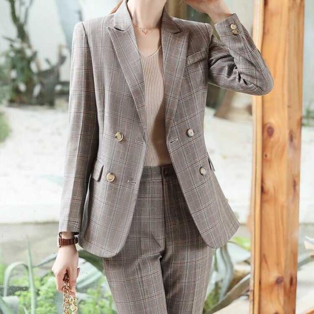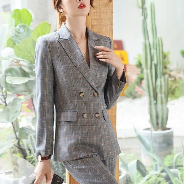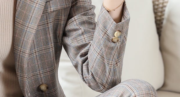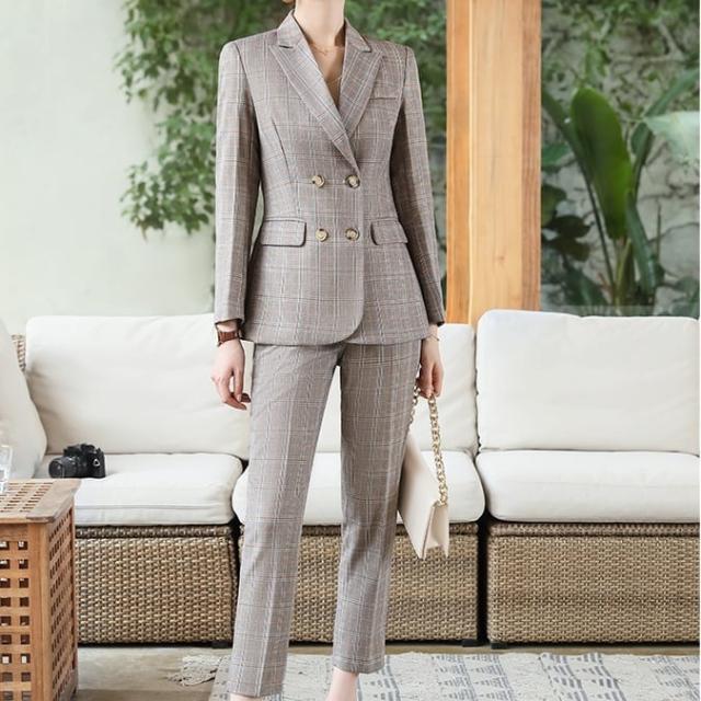 メリハリのあるスリムな仕立てのレトロなチェックパンツスーツセットです。