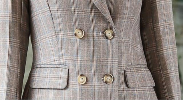ハイウエストとべっ甲ボタンのダブルブレストがシックなスジャケットと