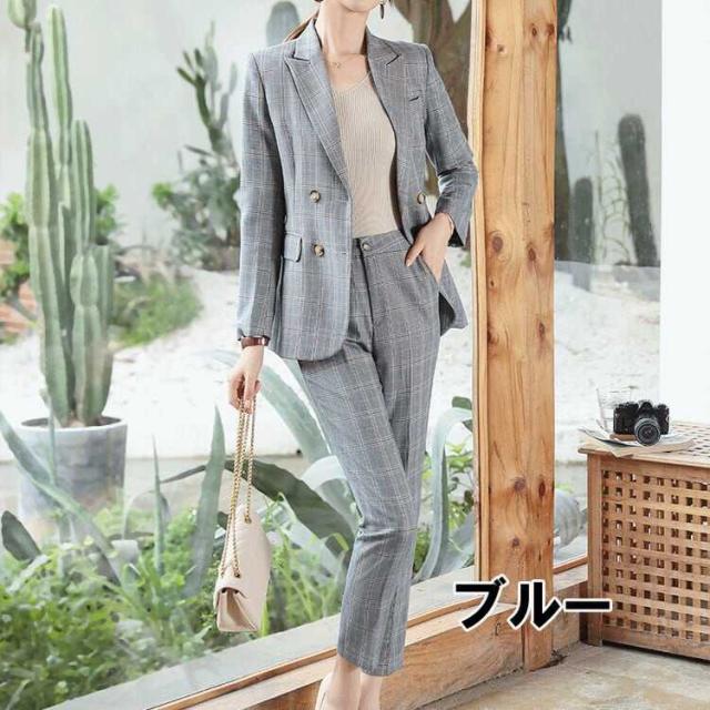 セットアップ スーツ パンツ ボトムス ジャケット ベルト付き 格子柄 チェック スクエアバックル 長袖 ロング アンクル丈 ハイウエスト ストレート 襟付き Vネック レトロ