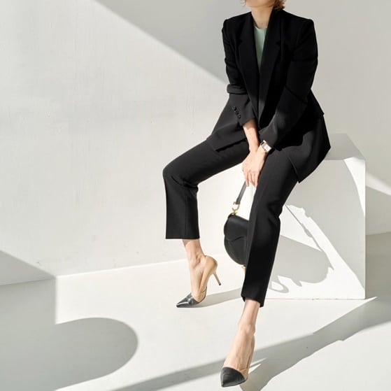 ハイウエストとベルト付きがこなれ感を演出するジャケットと