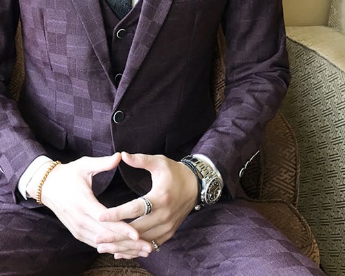 一つボタンのテーラードジャケット&テーパードパンツ&ベストの3点セット。