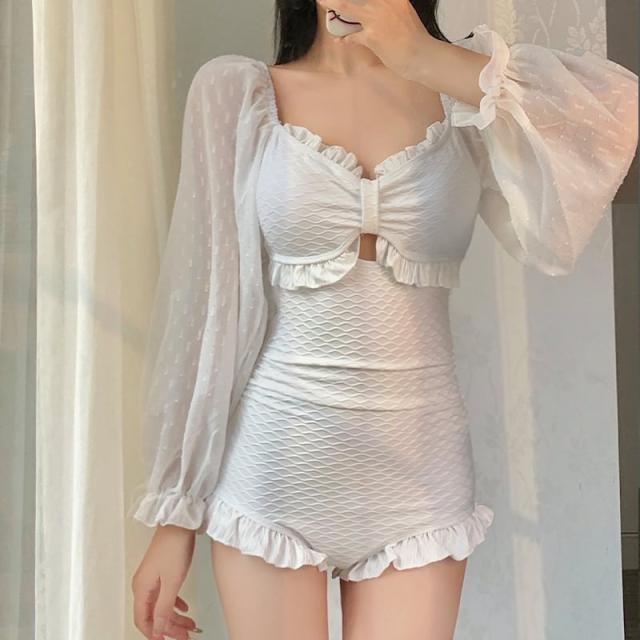 シアー素材の長袖が二の腕をカバーしてくれるワンピース水着。