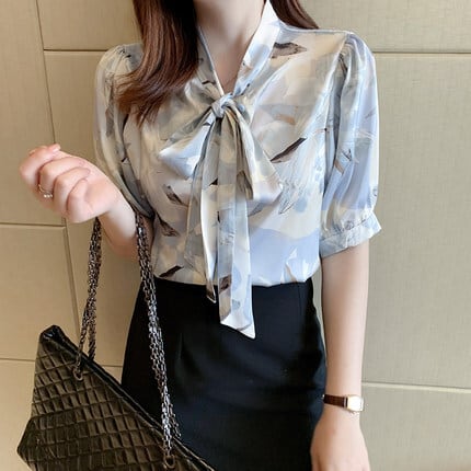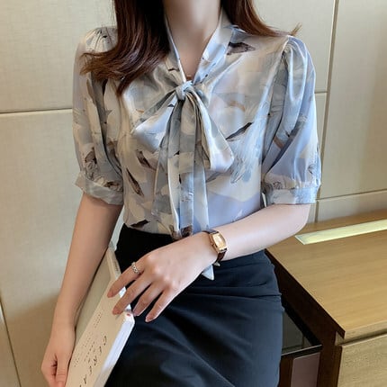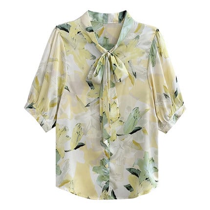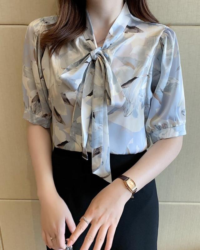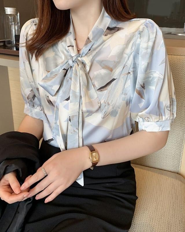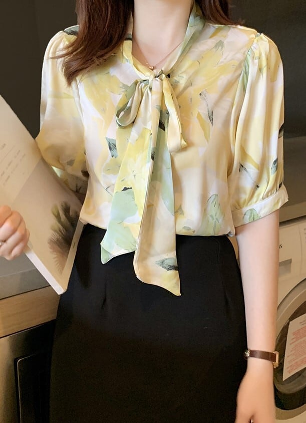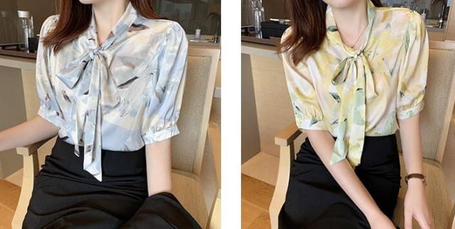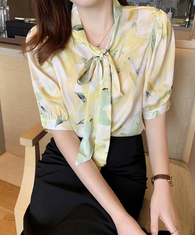ブラウス レディース シャツ トップス 人気 おすすめ おしゃれ お洒落 激安 安い 送料無料 プチプラ 半袖 美シルエット 華奢見え パフスリーブ ボウタイ リボン 花柄 新作 体型カバー