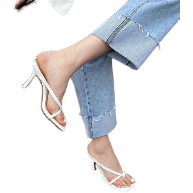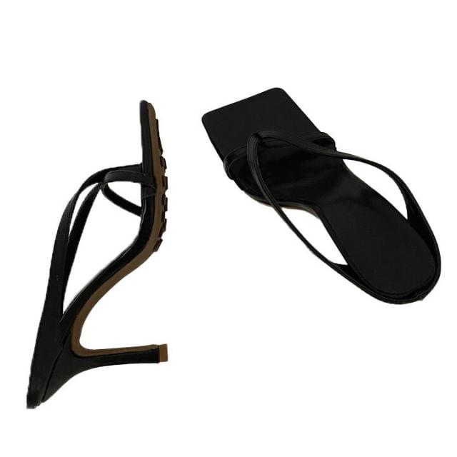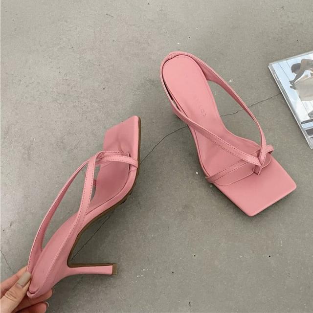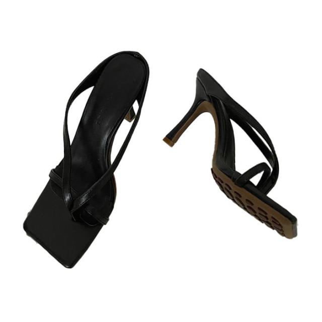 レディースシューズ 婦人靴 ハイヒール ピンヒール トングサンダル トングミュール スクエアトゥ フレンチライン レザー調 フェイクレザー 無地 ワントーン 脚長効果 スタイルアップ