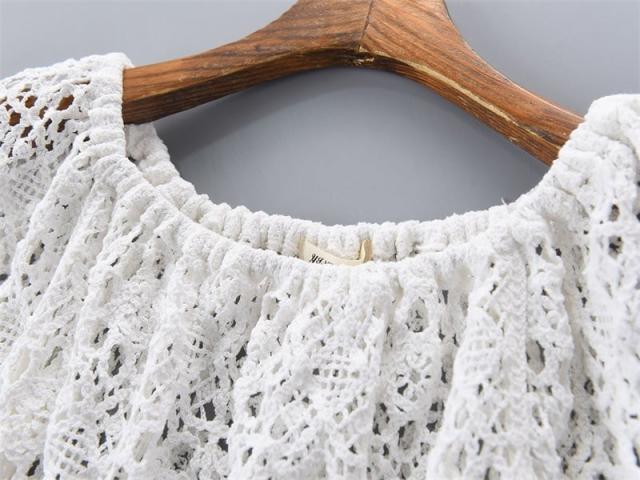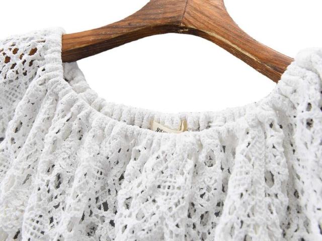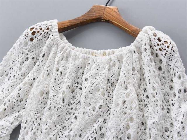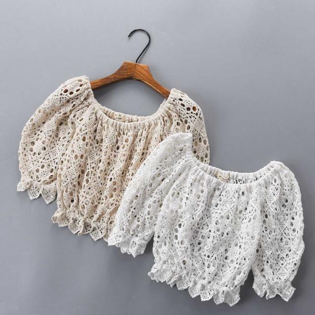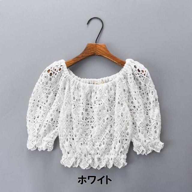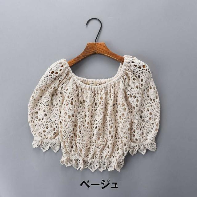 トップス レディース ブラウス カットソー 袖あり 五分袖 ラウンドネック ボヘミアン スクエアネック クロシェ 透かし編み ギャザー クロップ丈 透け感 ショート丈 バブルスリーブ