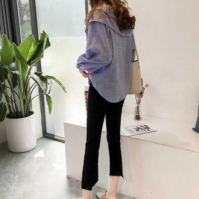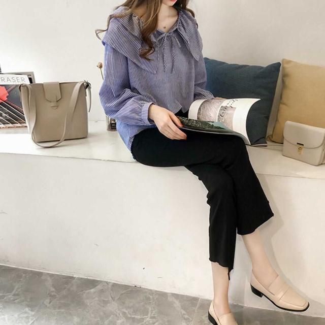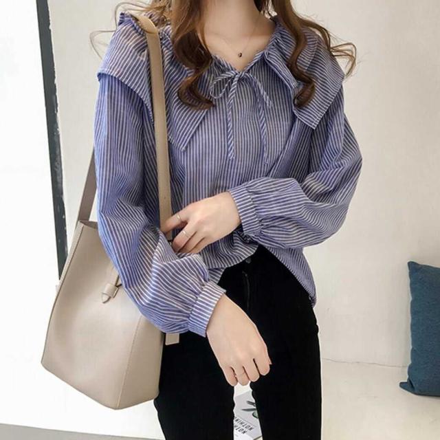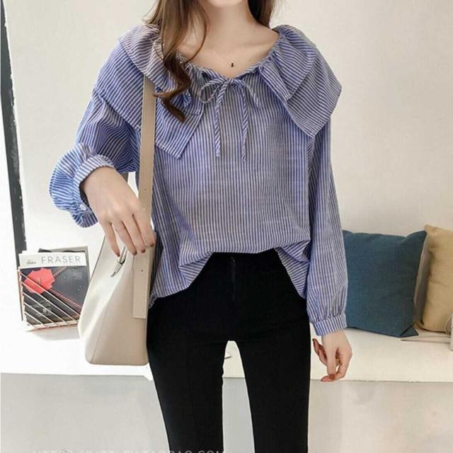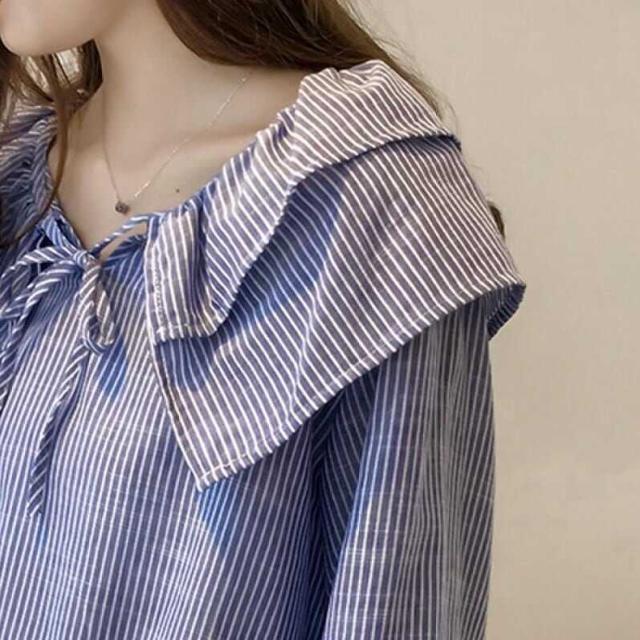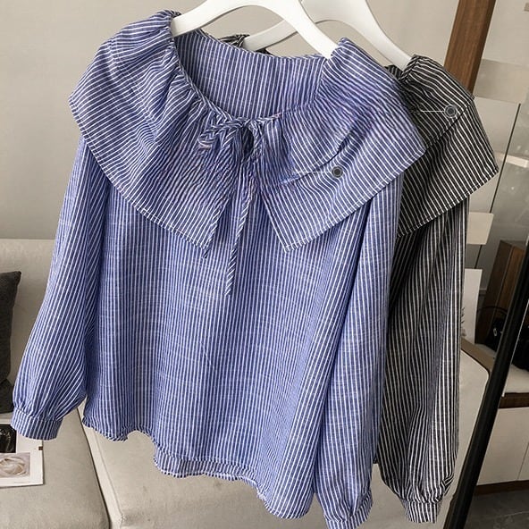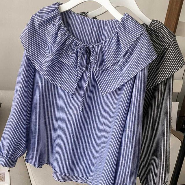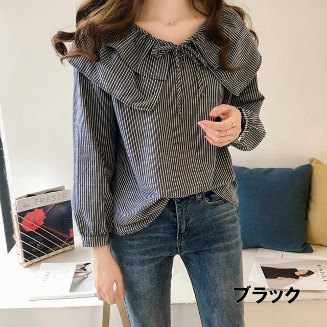 リボン付きの二重ラージカラーが可愛いストライプブラウスです。