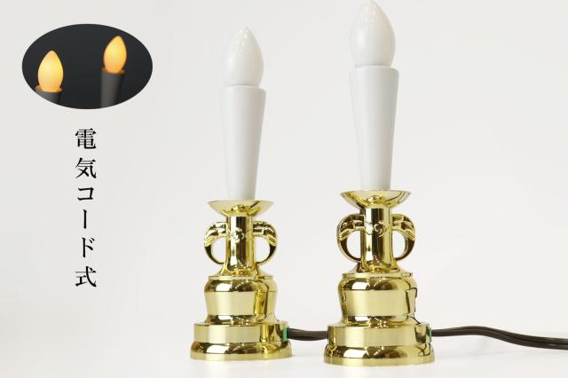 | 金色土台の電気ローソク 一対で電装コード式となります。仏具と神具としても扱えるタイプで、祀れば周りも一層華やかになります。 | |||