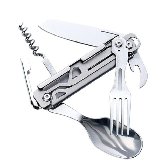 キャンピングマルチツール 全6機能 G002 ( スプーン フォーク ナイフ コルク抜 栓抜 缶切 食洗機対応 多機能 万能 マルチ カトラリー ステンレス アウトドア 防災 ツール キャンプ ステンレス製 )