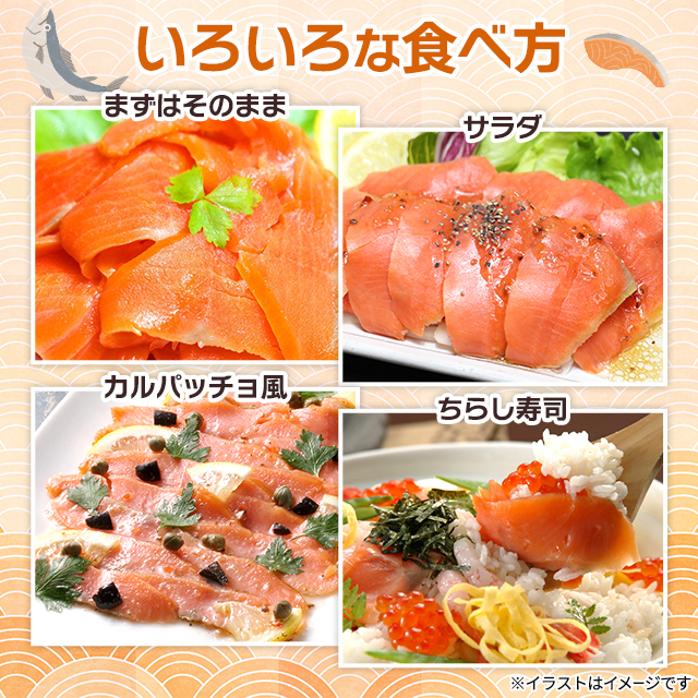 ・化学調味料、着色料を一切使わずに「塩」「砂糖」のみで味付けしたサーモン本来のおいしさを残す逸品。