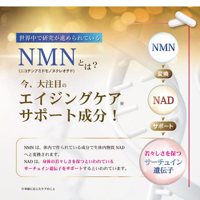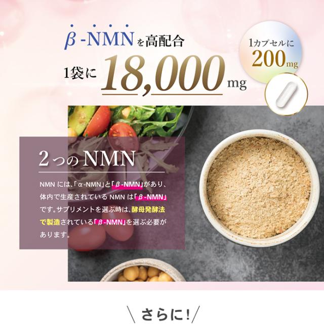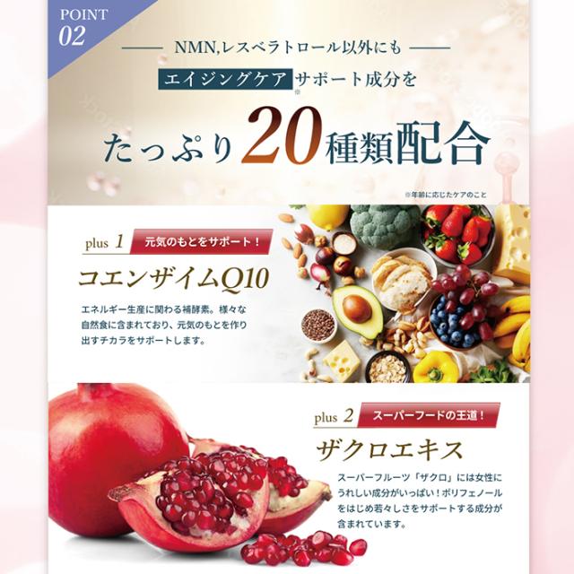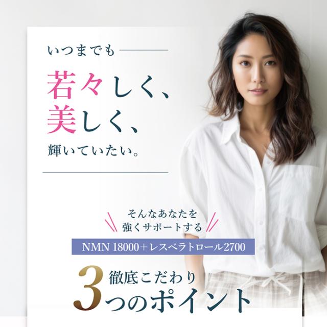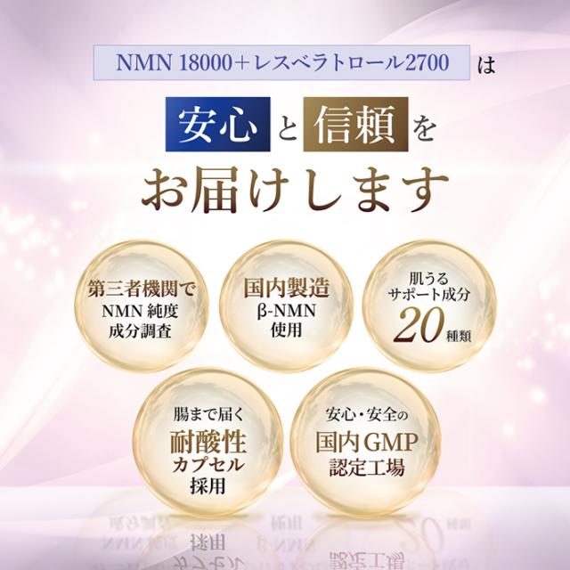 | 特徴 | 【腸まで届く植物性耐酸性カプセル】 科学的に安定した、植物性のカプセルを採用。NMNは唾液や水で純度が落ちますが、胃酸に負けない耐酸性カプセルなら高純度のまましっかり吸収します。 【厳選成分を高配合】 NMNと相性がいいとされる、レスベラトロールをたっぷり2,700mg配合しています。 【20種の美容サポート成分】 コエンザイムQ10、ザクロエキス、ユーグレナ、ビタミンB1、ビタミンC、アスタキサンチン、大豆イソフラボン、プラセンタ、コラーゲン、ヒアルロン酸、クロレラ、ローヤルゼリーFD末、エキナセアエキス末、ノニ果実エキス末、セルロース、リコピン、酸化マグネシウム、ルチン、エラスチン、コーンセラミドを配合し、お肌の調子を整えるサポートをします。 |
