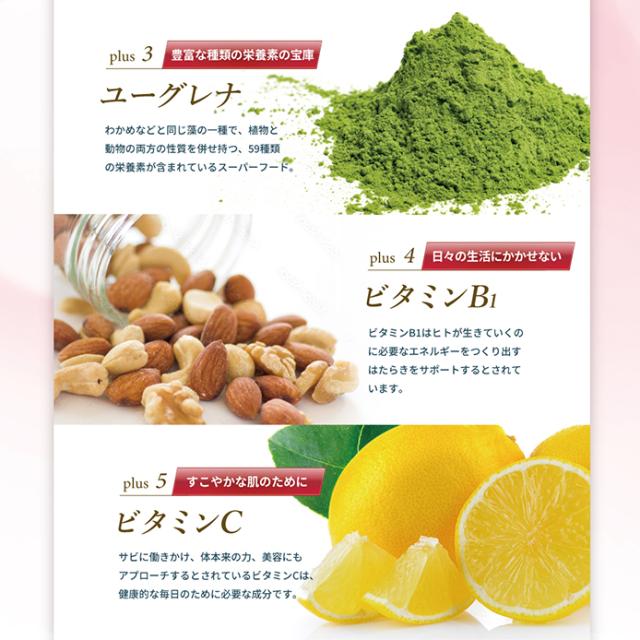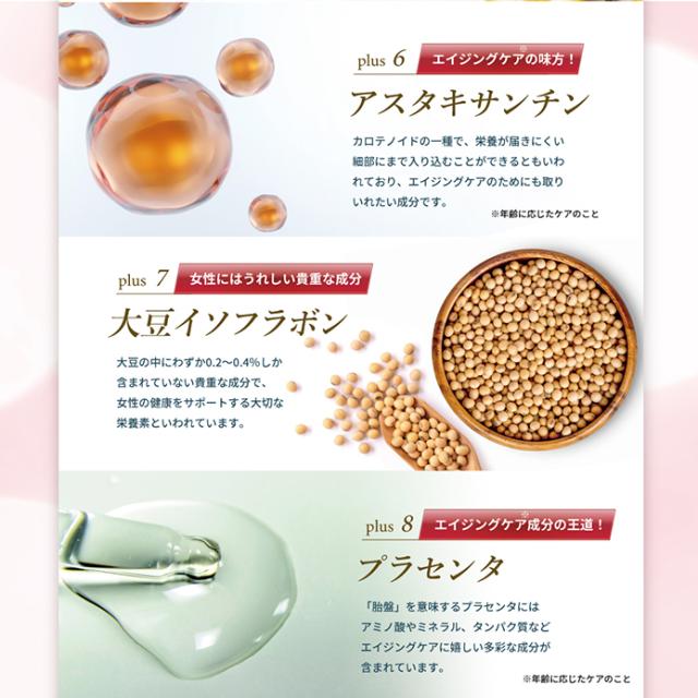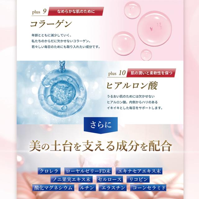 【20種の美容サポート成分】コエンザイムQ10、ザクロエキス、ユーグレナ、ビタミンB1、ビタミンC、アスタキサンチン、大豆イソフラボン、プラセンタ、コラーゲン、ヒアルロン酸、クロレラ、ローヤルゼリーFD末、エキナセアエキス末、ノニ果実エキス末、セルロース、リコピン、酸化マグネシウム、ルチン、エラスチン、コーンセラミドを配合し、お肌の調子を整えるサポートをします。