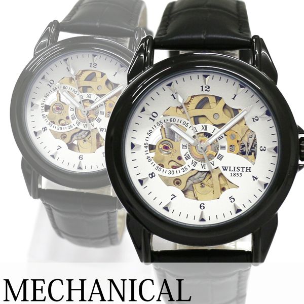 自動巻き腕時計 シンプル機能のスケルトンデザイン ブラックケース 革ベルト 機械式腕時計 WSA027-WHT メンズ腕時計 送料無料