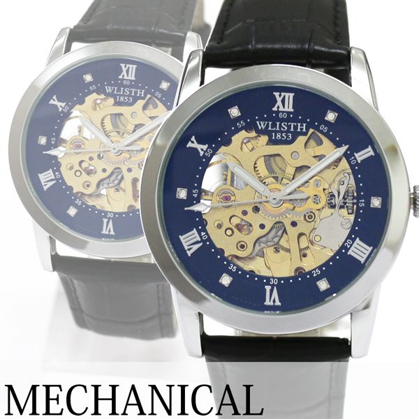 自動巻き腕時計 シンプル機能のスケルトンデザイン シルバーケース 革ベルト 機械式腕時計 WSA020-SVBK メンズ腕時計 送料無料