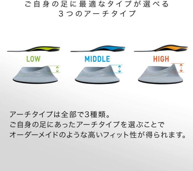 | 特徴 | 足裏のアーチなどのアライメントを適切にサポート。 足裏やふくらはぎ、すねへの負担を軽減します。 身体の不調の原因の一つとして、 足元のバランスが崩れていることが考えられます。 足元は身体全体を支える土台です。 この土台(アライメント)が崩れることで 身体全体のバランスに影響が生じ、不調に繋がると言われています。 足裏にあるアーチ(土踏まず)には身体を支え、 力を発揮する重要な役割があります。 足裏のかたちやアーチの高さは人それぞれ、 誰ひとり同じものは存在しません。 Footcraftであれば3つのアーチタイプから、 あなたの足裏のかたちにあったものを選ぶことができます。 理想的なアーチタイプを選ぶことによって、 身体全体のバランスが整い、パフォーマンスアップや 疲労・ケガの対策が期待できます。 |