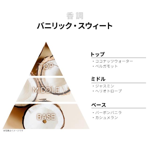 ココナッツ・ウォーターやベルガモットなどが、トロピカルなココナッツ・フレッシュを香り立たせるトップから、