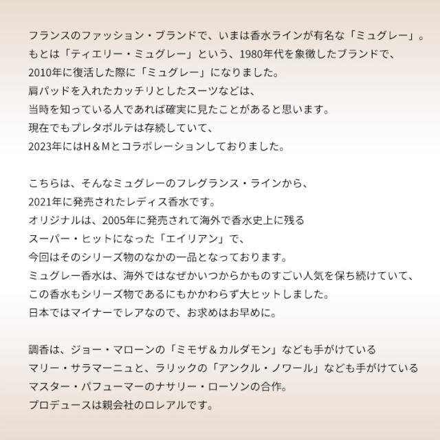 こちらは、そんなミュグレーのフレグランス・ラインから、2021年に発売されたレディス香水です。