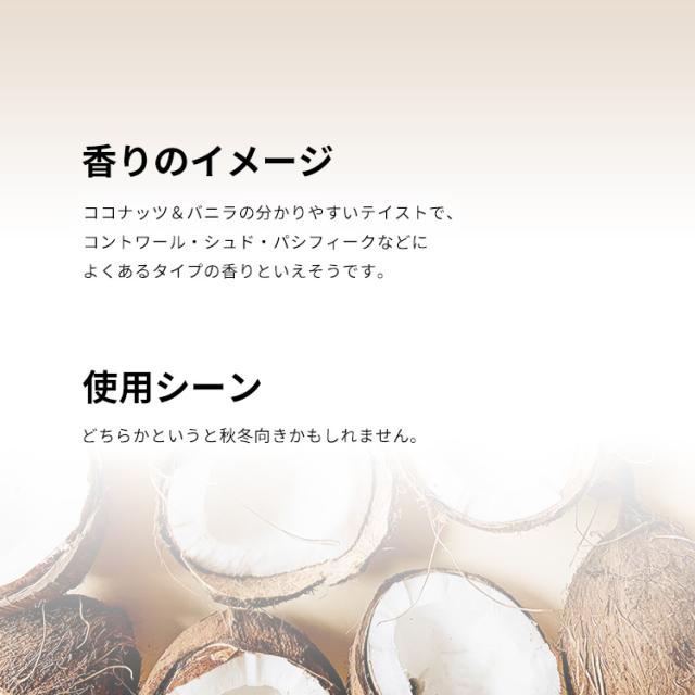 ココナッツ&バニラの分かりやすいテイストで、コントワール・シュド・パシフィークなどによくあるタイプの香りといえそうです。オー・ド・パルファン(EDP)らしい濃さでロングラスティングなところが好ポイント。どちらかというと秋冬向きかもしれません。
