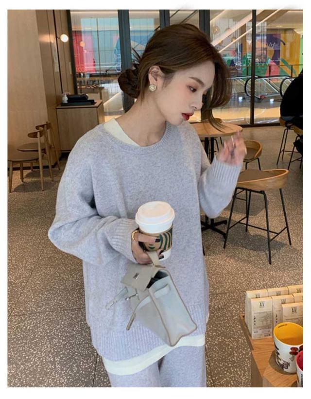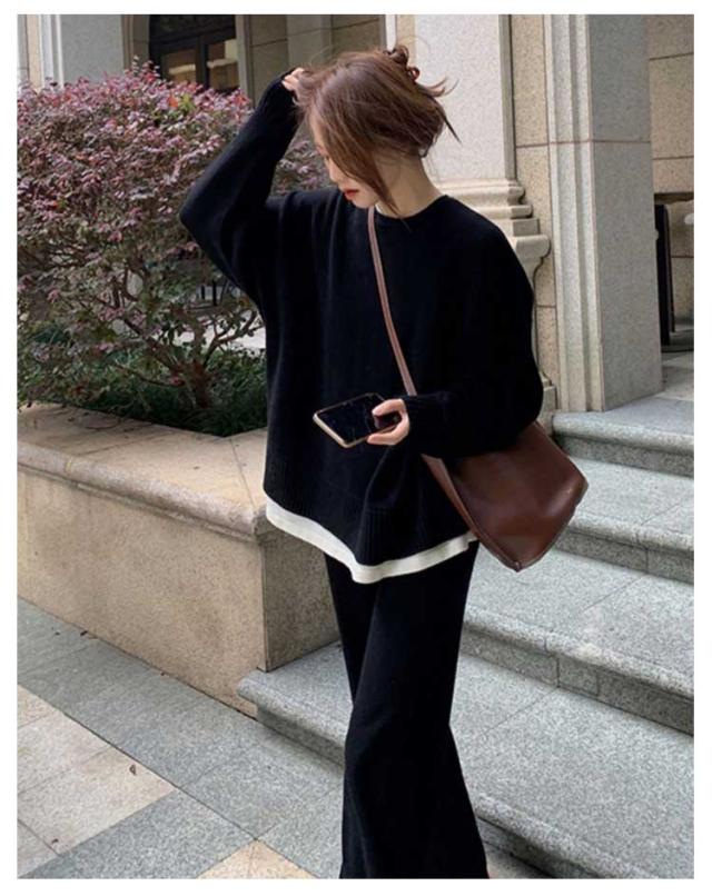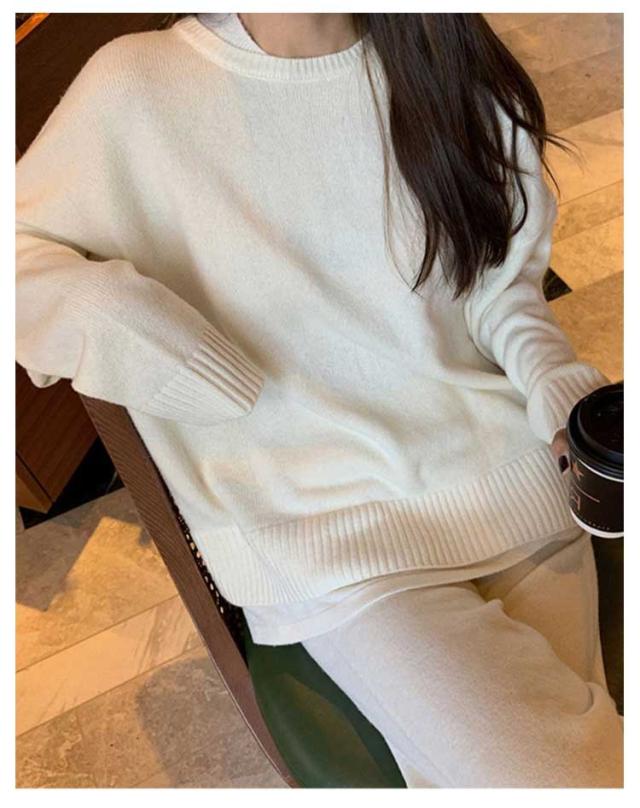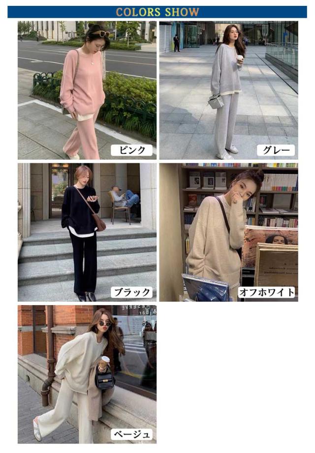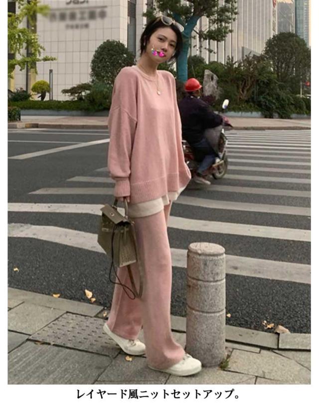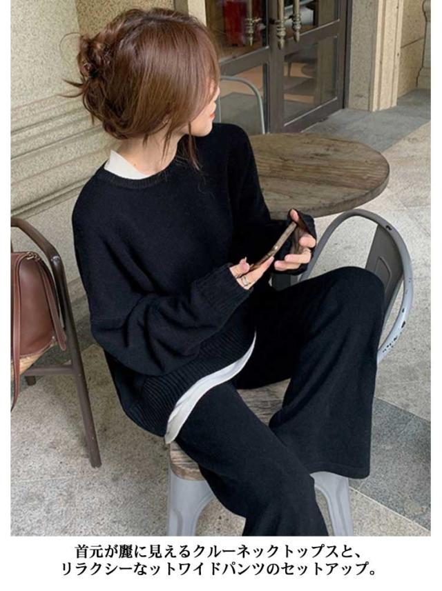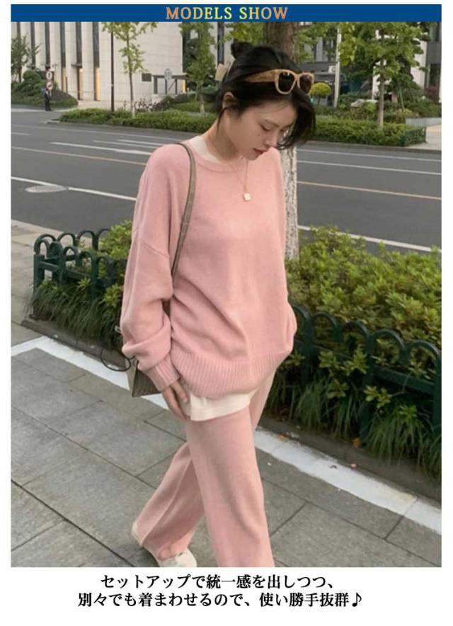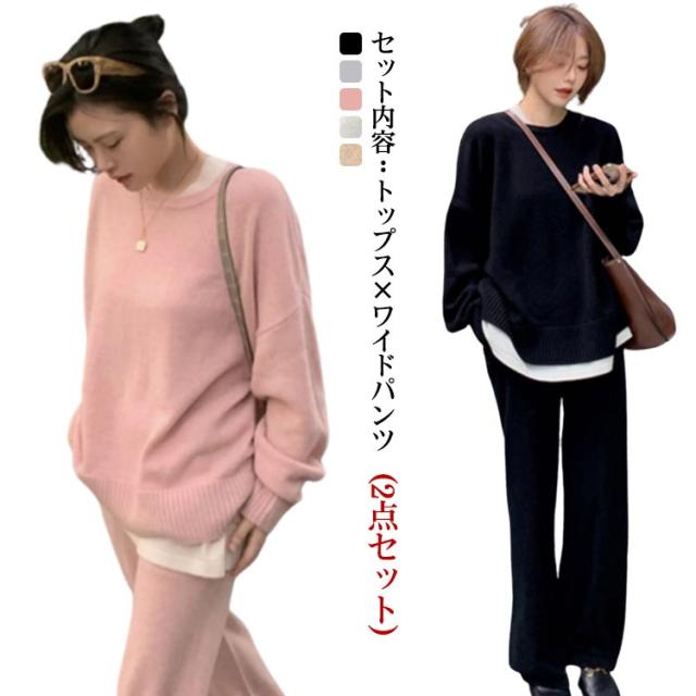 レディース 厚手 プルオーバー 秋冬 秋服 ゆったり セットアップ ワイドパンツ リブニット 春 長袖 おしゃれ ニットセットアップ クルーネック トップス ニットセーター 無地 通勤 カジュアル シンプル ニット 春服 2点セット