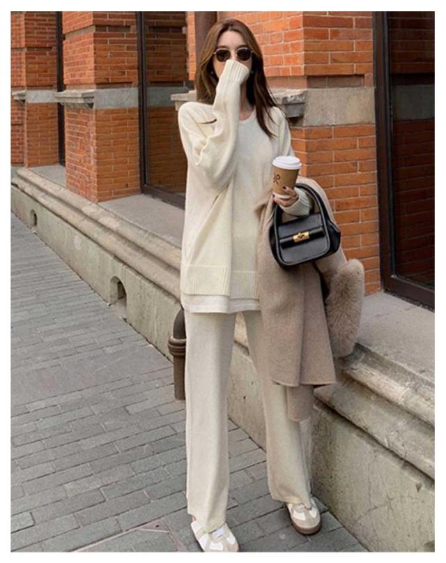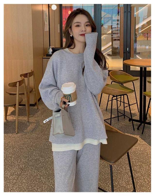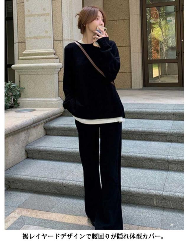 | セット内容:トップス×ワイドパンツ(2点セット)。 セットアップで統一感を出しつつ、別々でも着まわせるので、使い勝手抜群♪ 柔らかな生地は、さらっとした肌触りで通気性がよく着心地♪ レイヤード風ニットセットアップ。 首元が麗に見えるクルーネックトップスと、リラクシーなットワイドパンツのセットアップ。 裾レイヤードデザインで腰回りが隠れ体型カパー。 | |