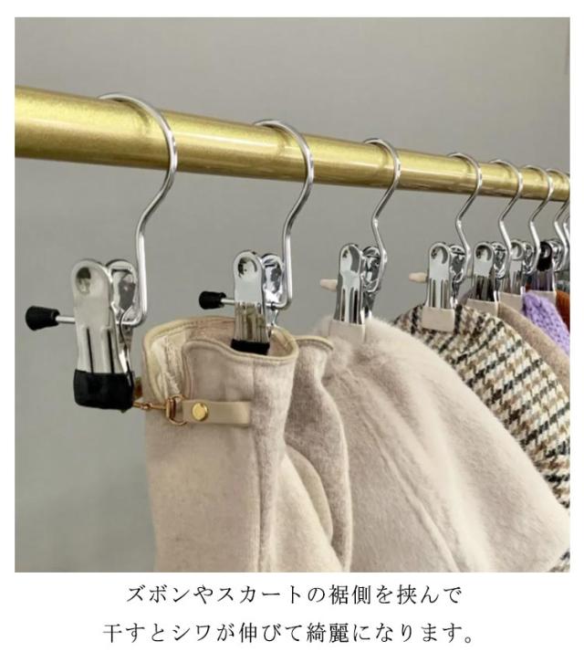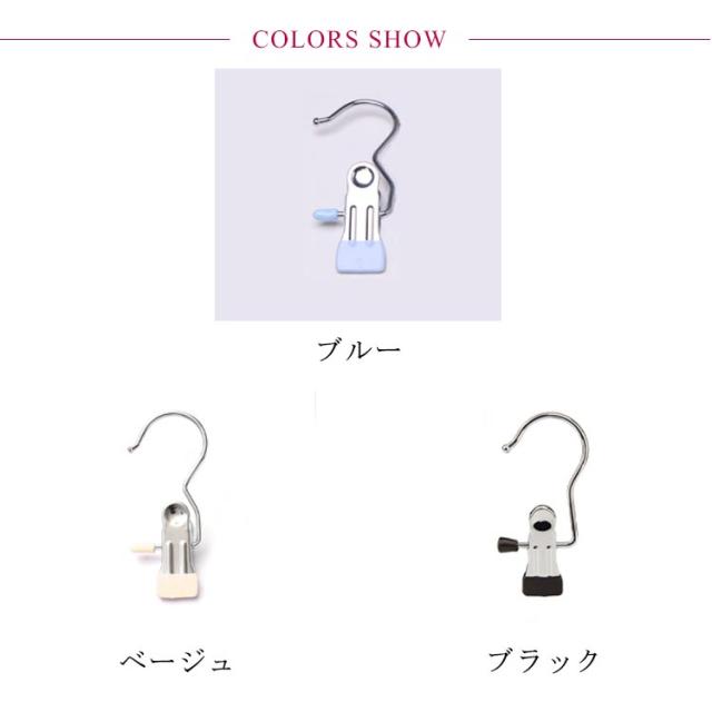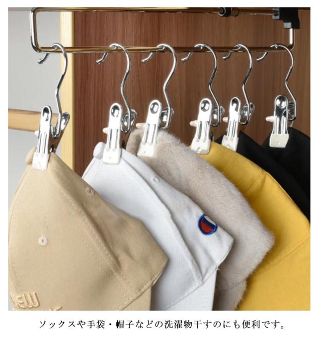 | フック付小物ハンガー。 軽い力で開く1クリップタイプで、ズボンやスカートなどの衣類をハンガーにかける作業がパッと終わります。 ソックスや手袋・帽子などの洗濯物干すのにも便利です。 収納したいアイテムを挟むだけで、簡単に吊るせます。 ズボンやスカートの裾側を挟んで干すとシワが伸びて綺麗になります。 ステンレス製なので錆びにくく、長く愛用していただけます。 PVC樹脂の特殊なコーティング加工で洋服が滑り落ちにくく、跡がつく心配もありません。 | |
