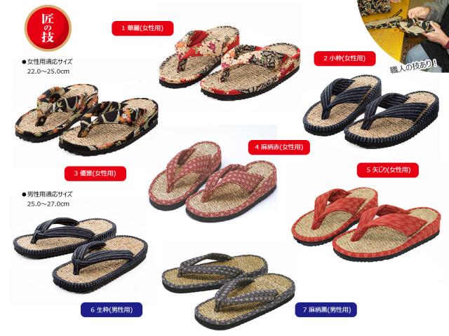 ■サイズ:女性用/22〜25cm、男性用/25〜27cm■材質:本体(表面)/自然草100%、鼻緒・縁/綿100%、裏底/EVA樹脂■商品重量(片足):女性用/約)146g、男性用/約)185g■原産国:日本