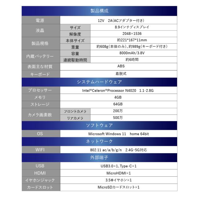 【公式ショップ】 M-WORKS 2in1 タブレットパソコン ノートパソコン Windows11 かな入力対応 WEBカメラ メモリ 4GB ストレージ 64GB 軽量 液晶 ディスプレイ 8.9インチ タブレットPC タブレット 9. タッチスクリーンパソコン