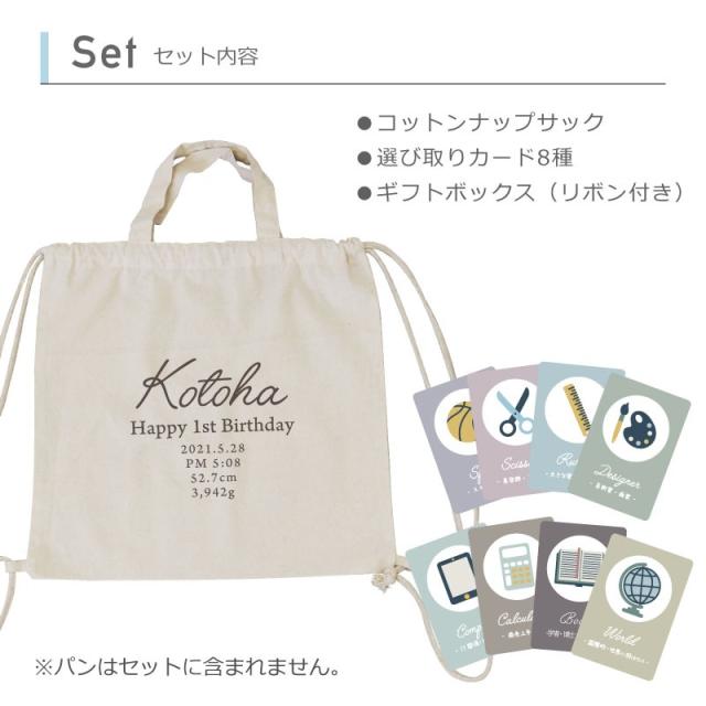出生日時入りだから、メモリアル感ばっちり。 写真に残すための大き目フォントデザイン。 選び取りカード付だから、イベント&撮影が一度に叶います♪ [ 3つのおすすめポイント ] 1)【特典】選び取りカード付き お子さまが選んでいるシーンも絵になるカードは 当店完全オリジナルデザイン。 おしゃれ感度の高いママ達に向けた、 くすみカラーがかわいい選び取りカードです。 初めて選んだカードはフォトフレームなどに入れて飾っても♪ 大きいサイズで手に取りやすく、写真映えも◎。 角丸仕様でお子さまにも安心です。 2)写真映えデザイン ナップサックは写真に映えるサイズを意識した大きめフォントデザイン。 いつか大きくなって写真を見たお子さまが “この日のために準備してくれたんだ” と感じる、お名前と出生年月日をプリント。 特別なメモリアル感を演出します。 3)クオリティ 一升餅 ・ 一升米 に限らず、一升パン もラクラク入る大き目サイズ。 どれでお祝いしようかな?と悩めるママも、これなら大丈夫。 1.8キロの重さに耐える、しっかり素材です。 SDGSを意識する方にも嬉しい、環境に配慮した無漂白エコマーク認定商品。 小さなお子様が手に触れるものだから、無漂白のリュックなら安心です。 イベントで使い終わった後は おむつ入れ や 着替え入れ などとしても。 - 無料ギフトラッピング - しっかりとした窓付きギフトボックスにお入れし、 光沢が美しいリボンでラッピングいたします。 ご自宅用であっても、 お子さまの1歳のお誕生日と一緒に、ママ1歳もお祝いしたい! そんな気持ちを込めて、ラッピングいたします。 |