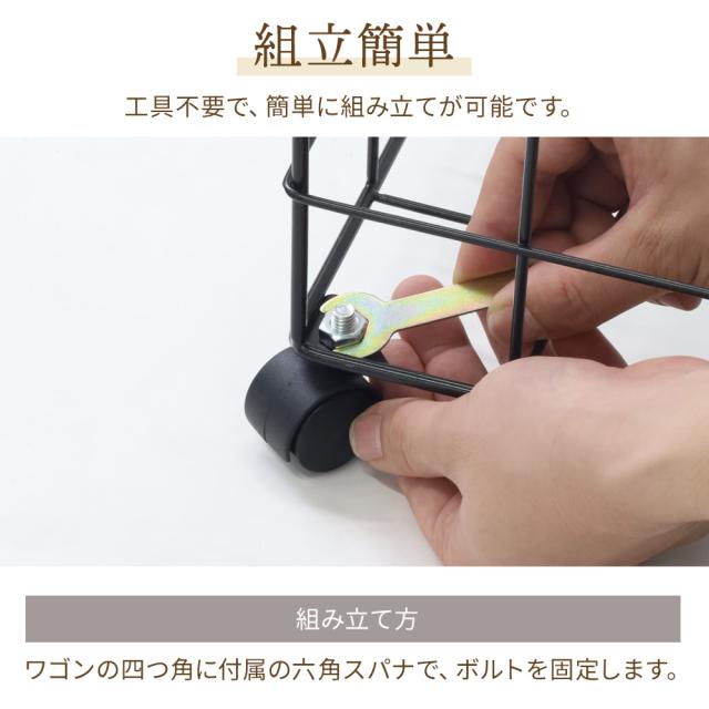 組立方法・・・ワゴンの四つ角に付属の六角スパナで、ボルトを固定します。