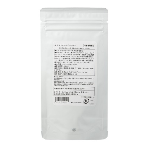 | 原材料名 | シャンピニオンエキス末(マッシュルーム、デキストリン)、クロレラ粉末、シソヨウ末、米胚芽・大豆醗酵抽出物、難消化性デキストリン、ガラクトオリゴ糖(乳成分を含む)、ユッカ抽出物、キラヤ抽出物/セルロース、ステアリン酸カルシウム、香料(ローズ)、微粒酸化ケイ素、チャ抽出物、鉄クロロフィリンナトリウム、へスぺリジン、クエン酸 |