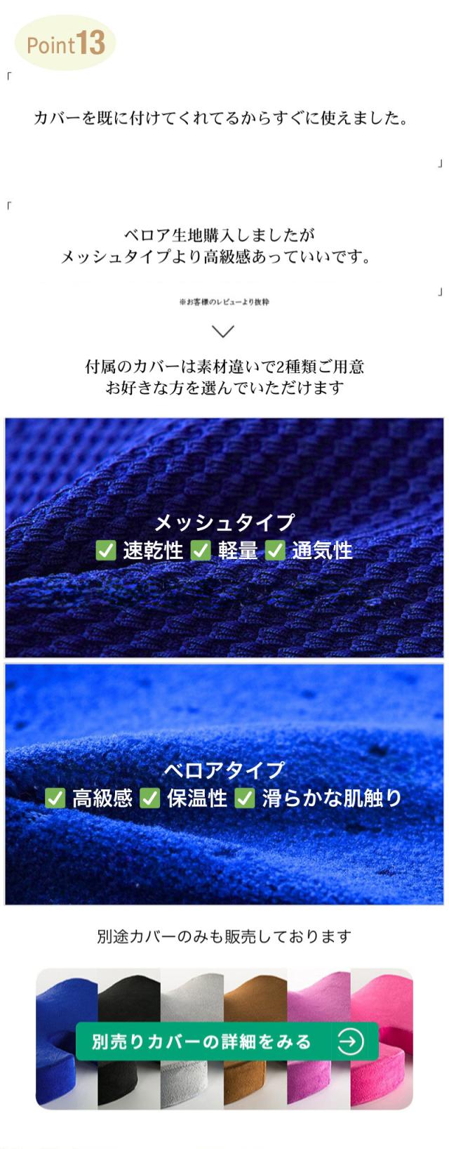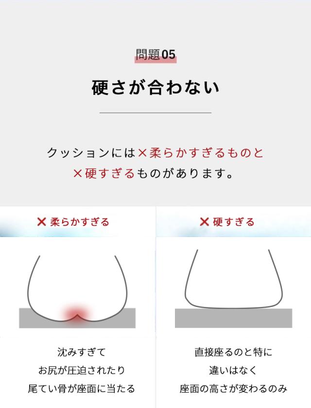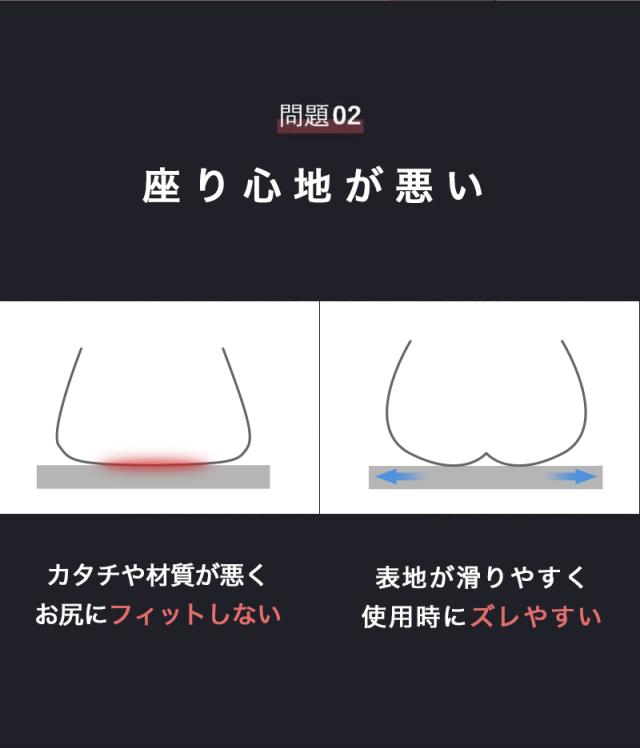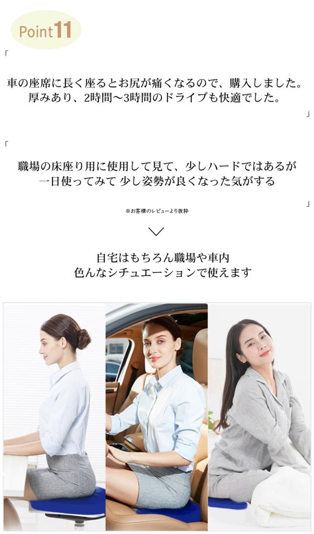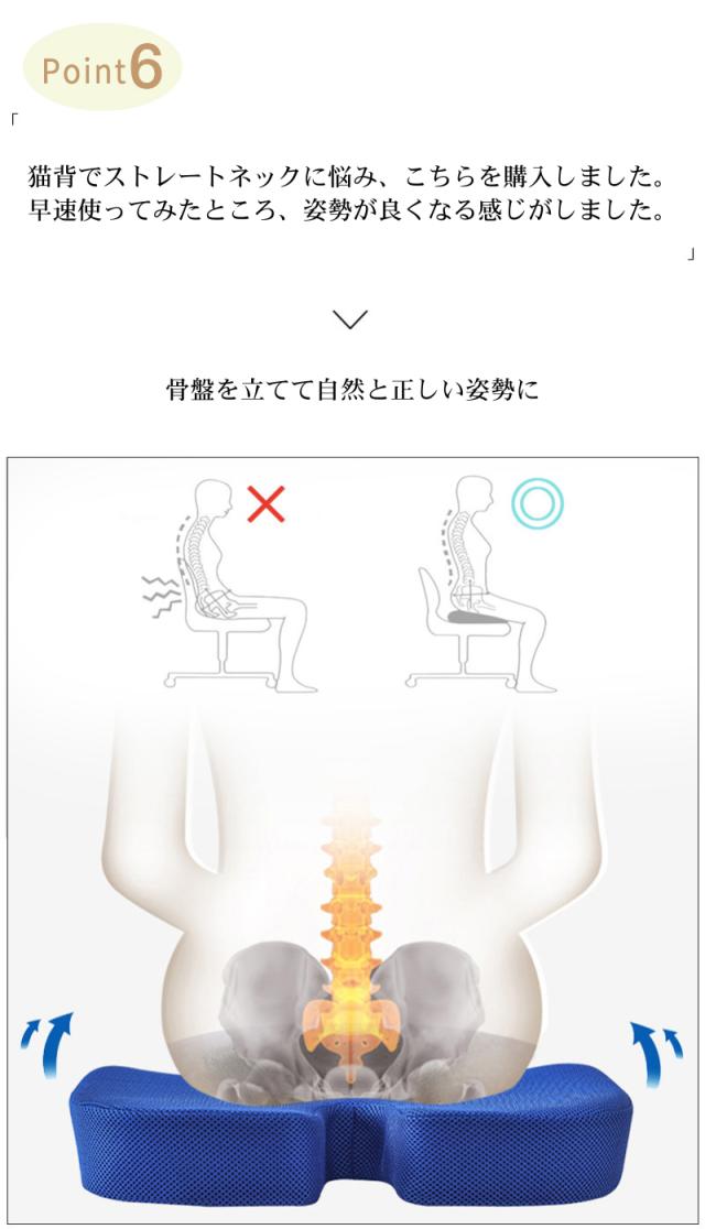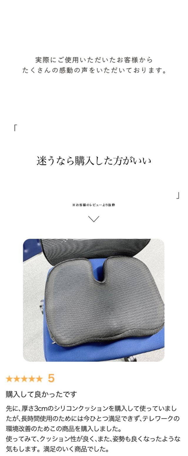 【姿勢を美しくするフォルム】 3D形状の流線型のフォルムにより、骨盤のゆがみを改善する効果が期待できます。座るだけで自然に前傾する姿勢を保ち、背筋が自然と伸びることで無理なく正しい姿勢へ導きます。オフィスチェアはもちろん、車や床、あるいはソファのクッションとしても最適です。 【ゲル素材と低反発のシナジー効果】 体重を分散させる性能が高いゲル素材と程よく柔らかな気持ち良い質感を与えてくれる低反発の両方を効果的に取り入れることでより快適に。 【U型構造】 U型構造とすることで、尾てい骨などの弱い部位に触れず、従来クッションと比較して圧迫感を軽減。尾てい骨をケアすることで、柔らかな座り心地と安定性を両立しました。 【人間工学デザイン】 お尻と太ももの形状にやさしくフィットします。臀部や太ももへの圧力を吸収・分散させ、長時間座っても疲れにくく、お尻の痛みを気にせず快適な座り心地の健康クッションです。オフィス / 車 / 車椅子 / デスク など様々な場所で利用可能。 |