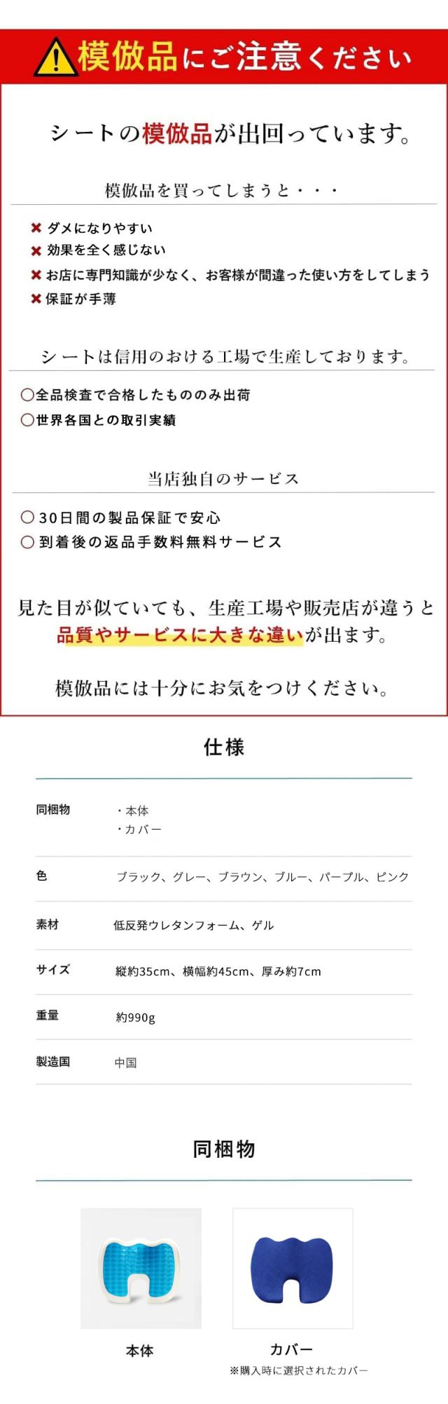 ■サイズ:(約)45 x 35×7cm ■重さ:(約)990g ■素材: 【カバー】ポリエステル 【クッション中材】ジェル素材+低反発ウレタンフォーム ■お手入れ方法:カバーはクッションから外して洗濯機で丸洗い可能(色移りしやすい素材とは一緒に洗わないようご注意ください)。?????クッション本体は乾いたタオルでお拭きください。 ※商品のカバーの色が、椅子などに色移りする可能性がございます。色移りしやすい皮製品などへの上には置かないようにご注意ください。 ※実物のサイズについて、製造誤差含め±3%程度、値が異なることがございます。 ※色味についてはモニターにより実物とやや異なることがございます。ご了承ください。 ※ご注意※ 本製品は医薬品・医療機器ではございません。 |