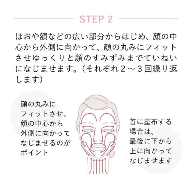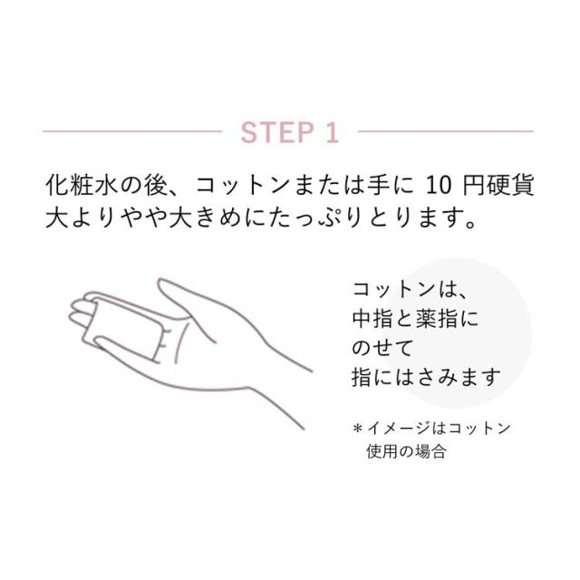 ・化粧水の後、コットンまたは手に10円硬貨大よりやや大きめにたっぷりとり、ていねいになじませます。