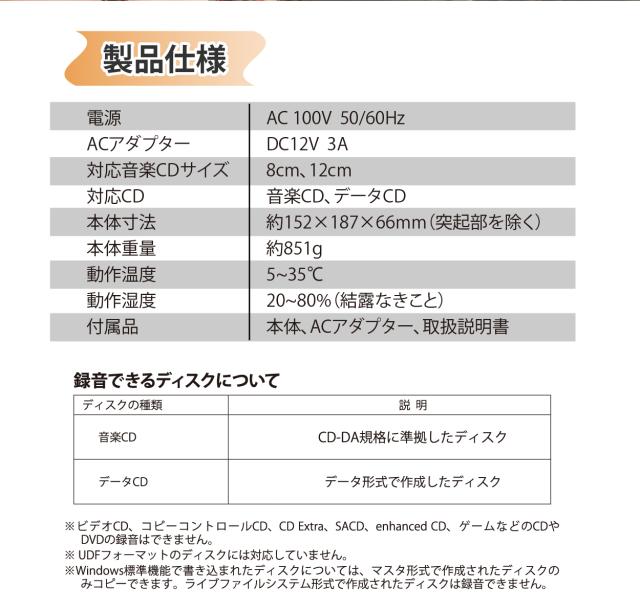 ・対応音楽CDサイズ:8cm、12cm ※特殊形状のCDを除く