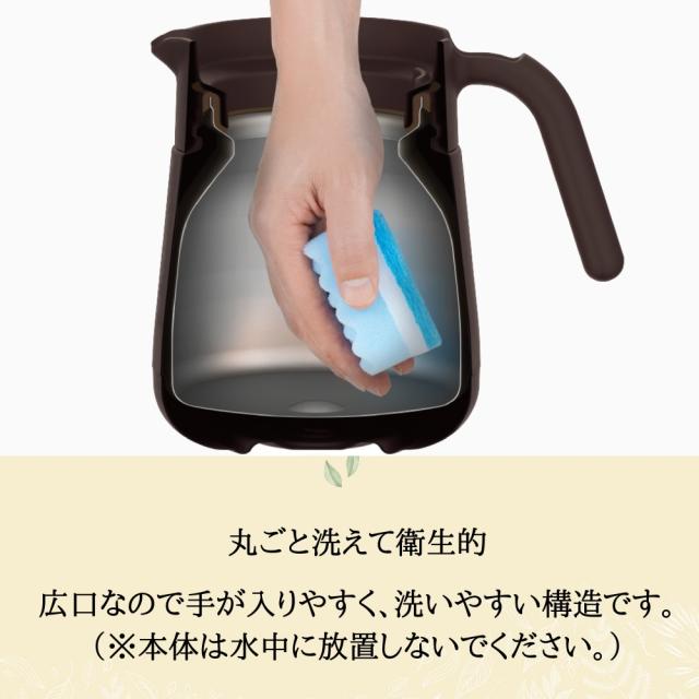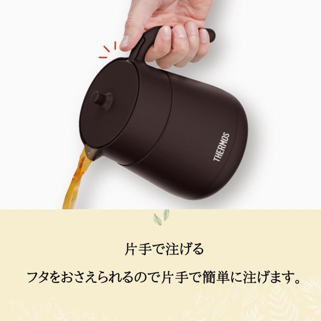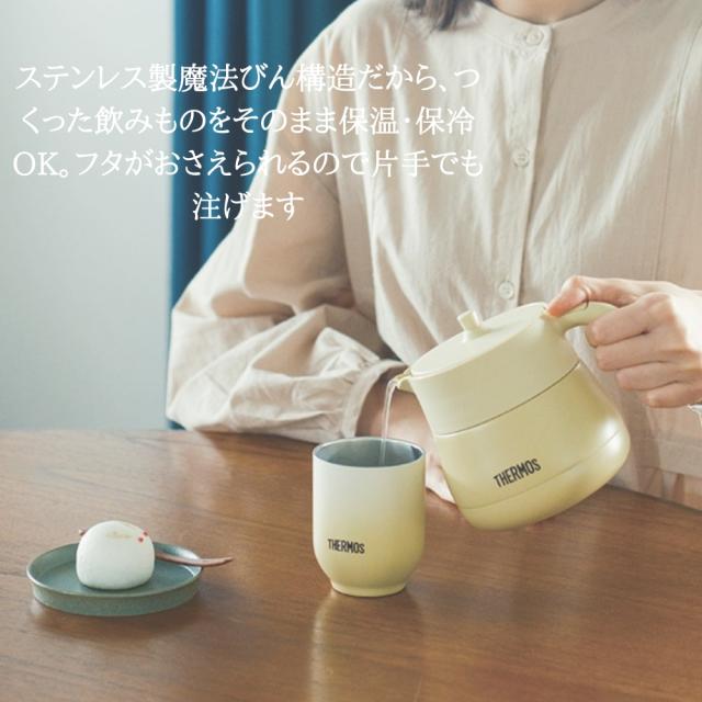 茶葉を直接入れられるストレーナー付きのティーポットです。本体はステンレス製魔法びん構造のため、つくった飲みものをそのまま保温・保冷OK。フタがおさえられるので片手でも注げ、約カップ3~5杯分のお茶がつくれます。