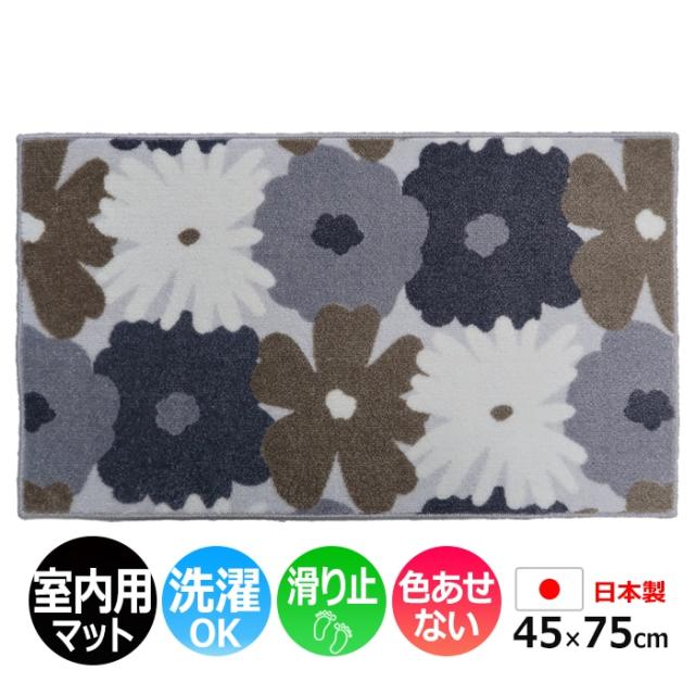 玄関マット 室内 おしゃれ 北欧 洗える マット キッチン 室内 屋内用 約 45×75cm 北欧 かわいい 花柄 洗えるマット グレー モダン SOU・SOU ソウソウ おおらかとりどり (R) 新生活 滑り止め付き フロアマット 日本製 裏面不織布 洗面所 脱衣所