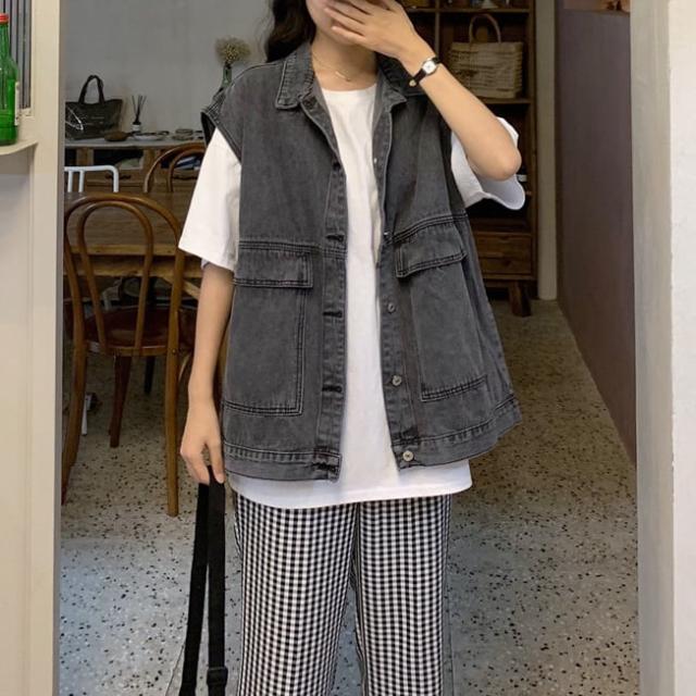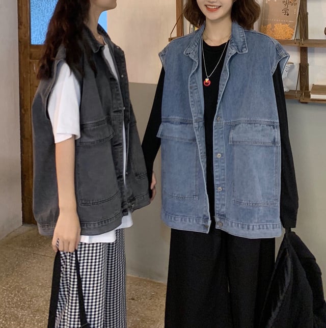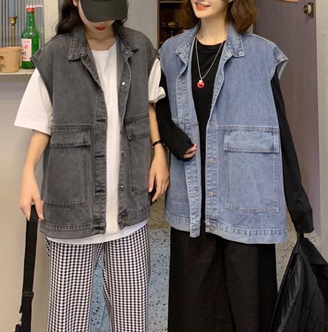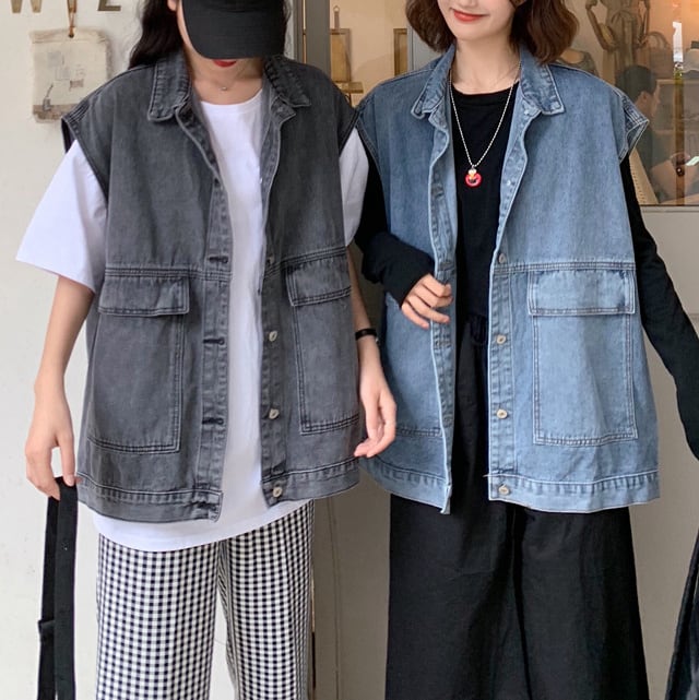 デニムジャケット アウター 上着 ミドル丈 チュニック丈 ロング丈 ボックスシルエット 無地 襟付き シングルブレスト フレンチスリーブ 体型カバー 可愛い かわいい きれいめ 大人 抜け感